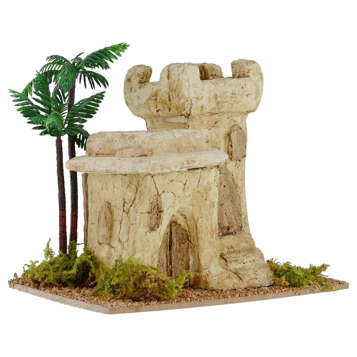 Casa palestinese con torre. La scenografia si presenta ben rifinita: l'abitazione possiede la classica struttura araba con tetto piatto. La torre è dotata di suo ingresso proprio. Essa è creata artigianalmente in gesso ceramico. E' presente, inoltre, una palma doppia. L'utilizzo del muschio rende il paesaggio più naturale. Prodotto realizzato interamente in Italia da sapienti mani artigiane utilizzando il gesso ceramico, il legno, il sughero ed il muschio. Consigliato per statue di altezza 3,5 cm e per la realizzazione di paesaggi in lontananza, giocando sulla prospettiva.