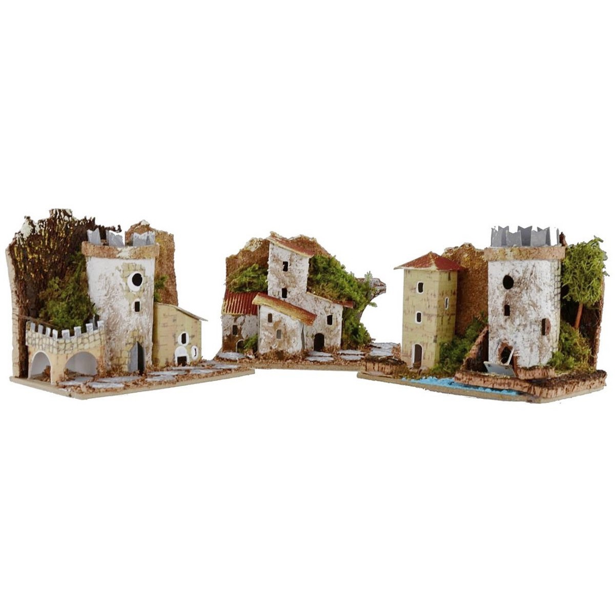 Set 3 casette per presepe con base e ambientazione in sughero. Il tris si compone di un grande cascinale, un castello ed infine una torre quadrangolare con ponte che attraversa il fiume. Questi articoli sono ideali per realizzare il paesaggio in lontananza, gli interni si possono illuminare forando il retro della casa e inserendo la vostra lucina.
