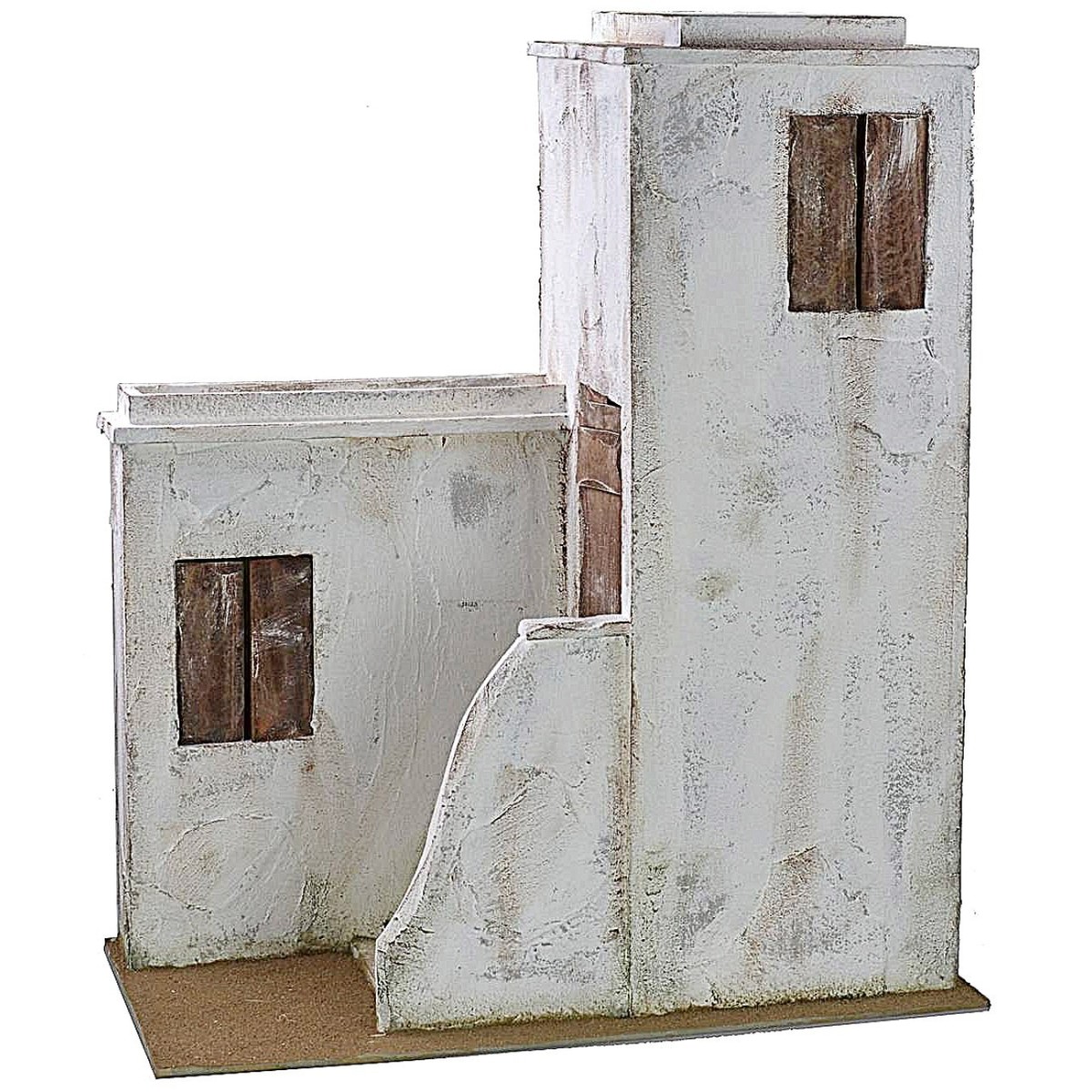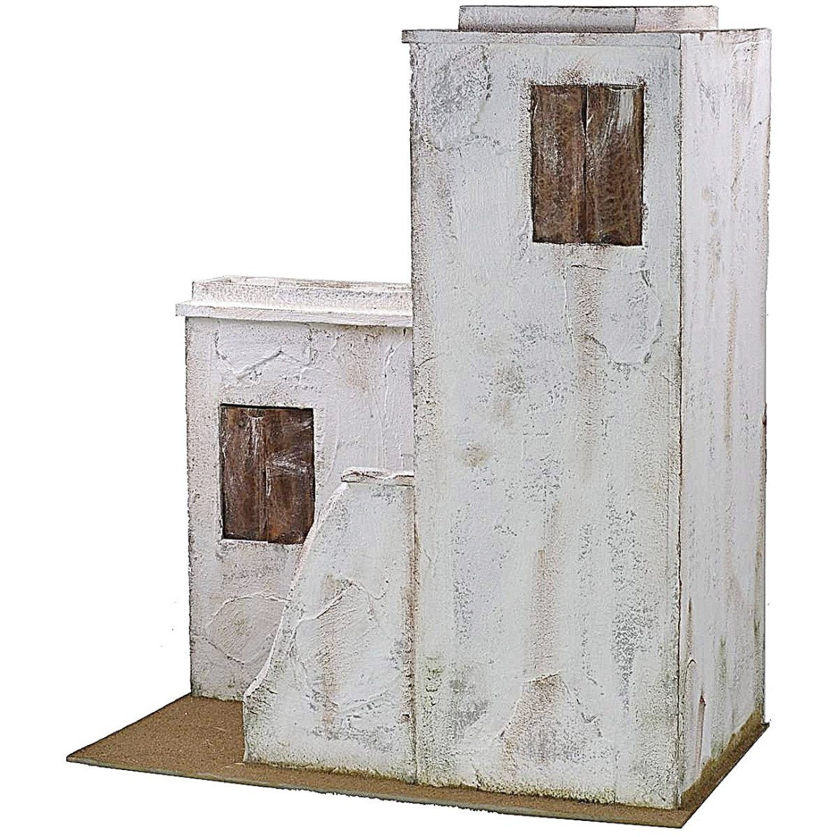 Abitazione araba per Presepe. La casa si presenta molto ben rifinita: essa è realizzata interamente in polistirene e legno ed è dotata di un portone d'ingresso a doppio battente, una finestra e di un tetto quadrato, tipico dello stile arabo. Questo prodotto è stato realizzato da sapienti artigiani italiani per il Presepe in stile palestinese; la struttura è adatta a statue di dimensione 30 h cm.