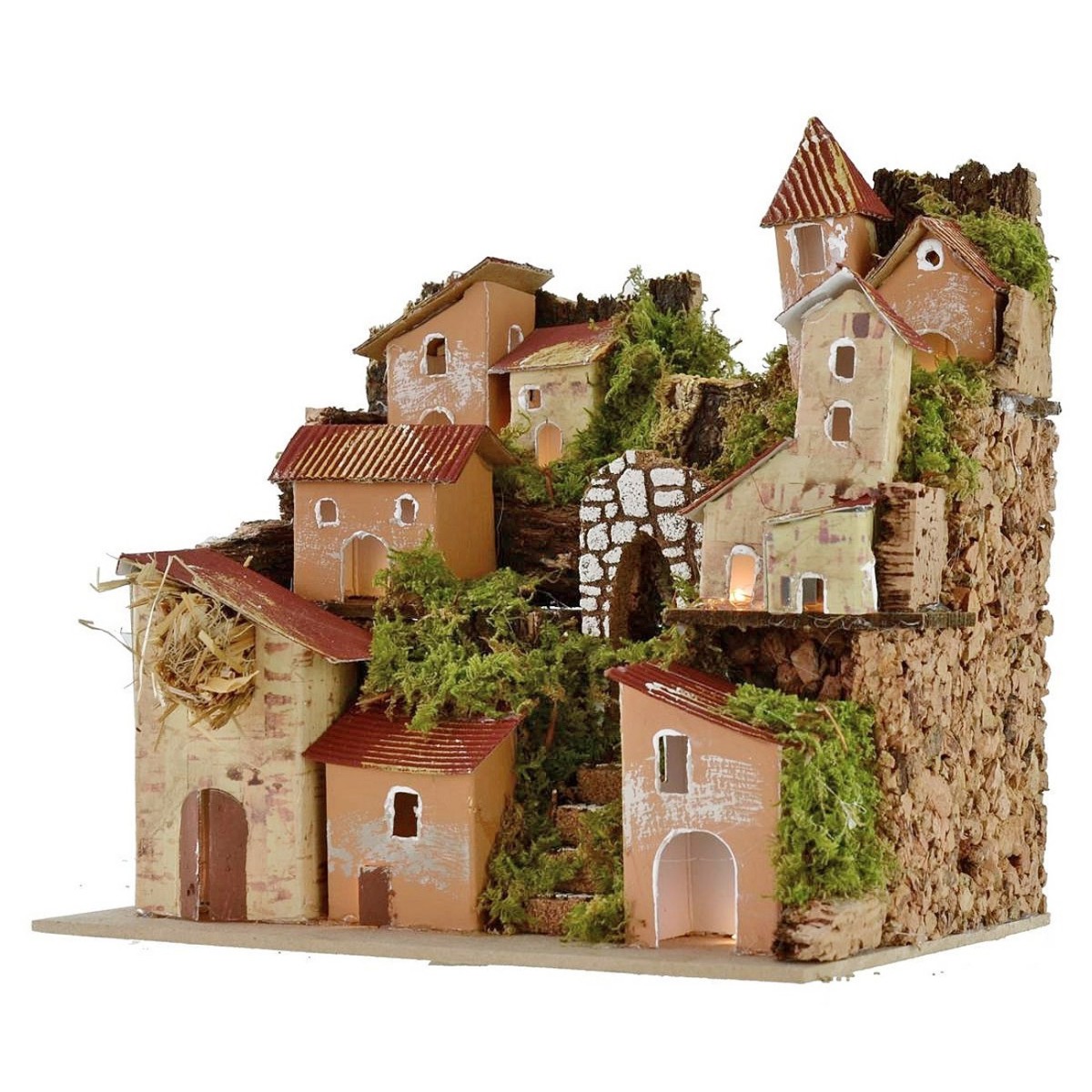 Ambientazione per il Presepe classico popolare raffigurante un villaggio in lontananza illuminato con led a luce bianca calda funzionati a pile AAx3 non incluse. La scenografia risulta colma di dettagli e molto ben rifinita, grazie all'uso della corteccia e del muschio che simulano una fitta vegetazione. Questa ambientazione è stata realizzata da sapienti artigiani italiani per il Presepe classico popolare in sughero, legno e muschio. Ottima per rendere unico il proprio Presepe.