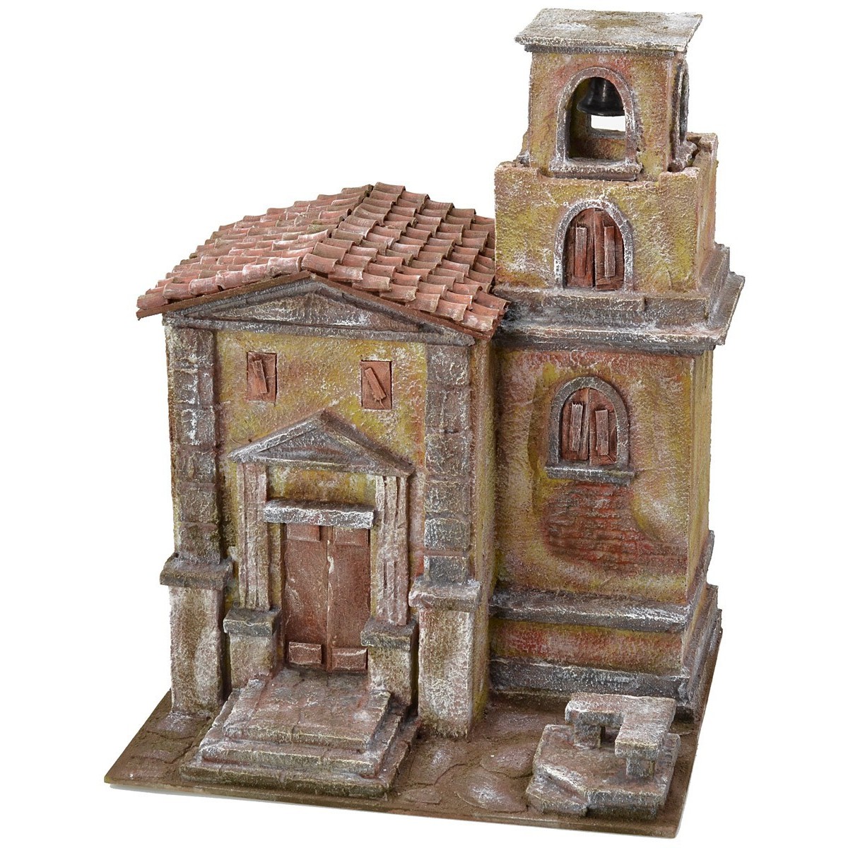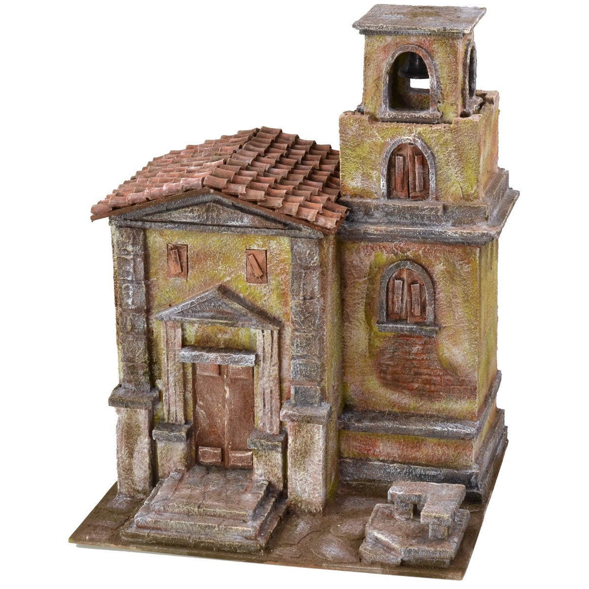 Chiesa ben rifinita nei particolari. l'ingresso è caratterizzato da ampie scalinate e la facciata presenta ai lati delle finte colonne di pietra scanalata, mentre al centro è caratterizzata da una doppia architrave: una grande nel sottotetto e una che ripercorre la parte superiore del portone. Nel sagrato davanti all'imponente campanile è presente una panchina in pietra. Articolo di notevole bellezza realizzato interamente in Italia da sapienti mani artigiane utilizzando polistirene ed legno e adatto a statue di 10cm.