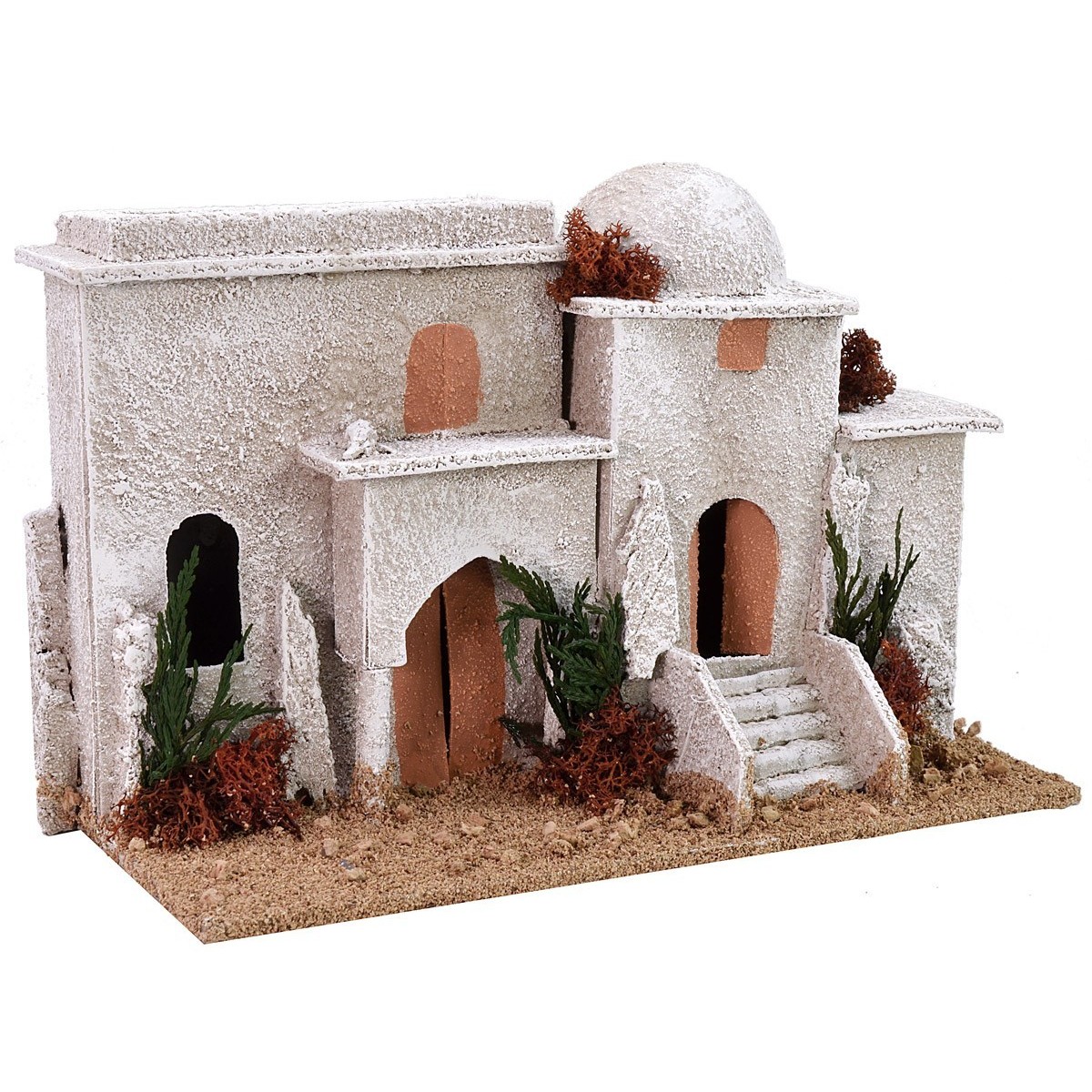 Gruppo di case palestinesi ben rifinite dove sono presenti due ingressi, uno caratterizzato da una scalinata e uno da un arco con pilastri. Il tetto delle strutture è piatto con la presenza di una cupola e l'ambiente circostante è arricchito da una colorata vegetazione. Con l'utilizzo di apposite luci che si possono trovare sul sito nella categoria 'illuminazione presepe' è possibile illuminare le case. L'articolo prodotto in Italia con legno sughero e muschio è adatto x statue di altezza 5-6 cm.