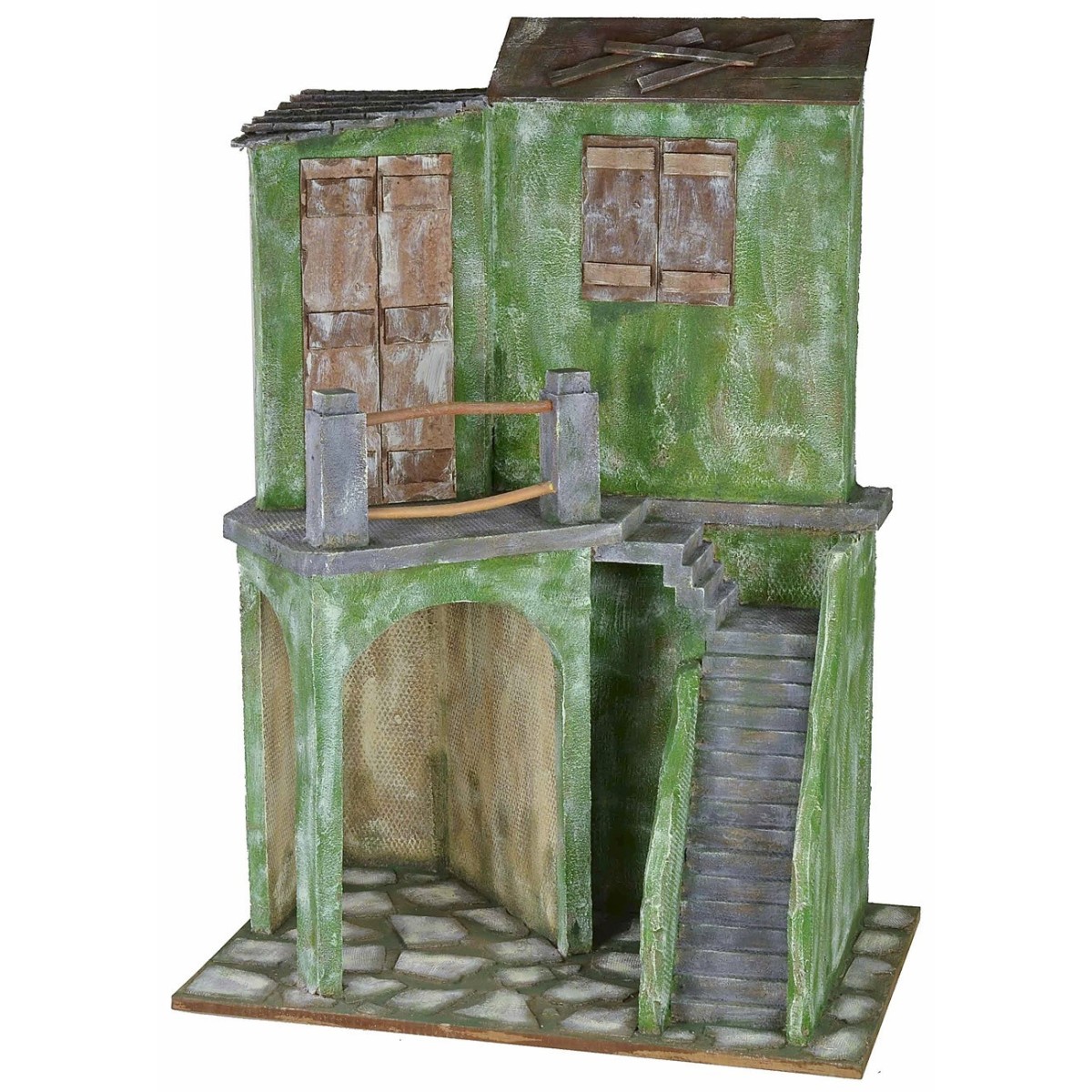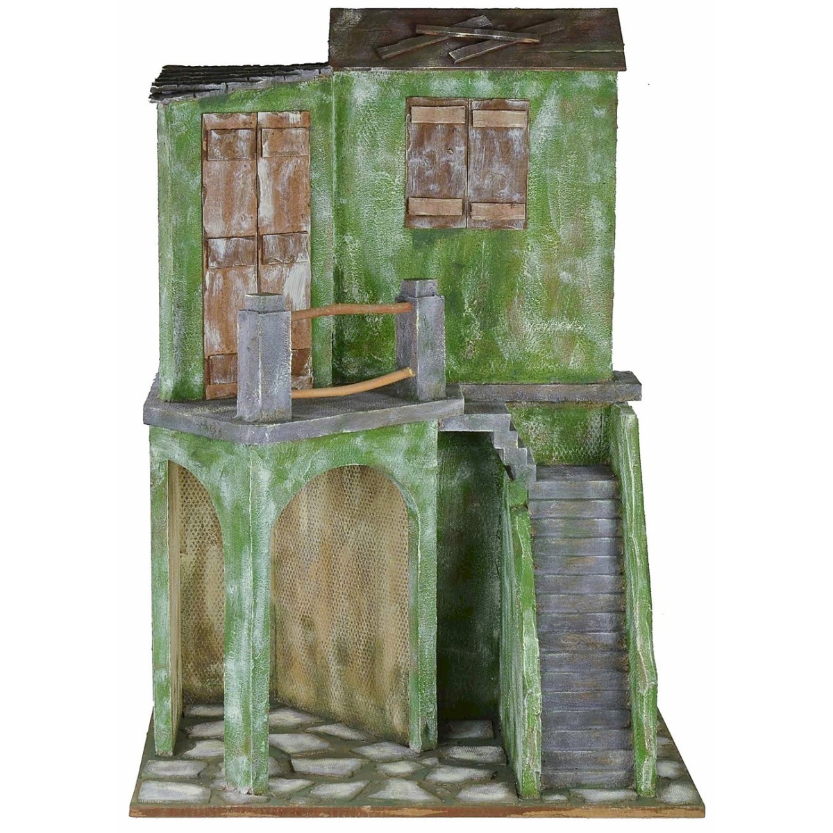 Casa per il Presepe classico popolare ben rifinita nei dettagli; al piano terra un porticato con archi ottimo per la realizzazione di una bottega, una scalinata conduce al piano superiore dove è presente un'abitazione caratterizzata da una porta e finestra in legno. Prodotto realizzato da sapienti artigiani italiani in polistirene e legno ed è consigliato per statue di altezza 30 cm.
