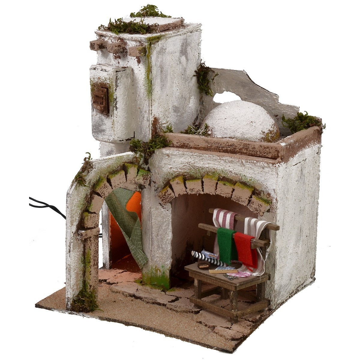 Casa palestinese illuminata, disposta su due piani e con la bottega di una sarta, ben rifinita nei dettagli: al piano inferiore notiamo la bottega della sarta, davanti alla quale è presente un banchetto espositivo con molteplici minuterie di stoffe, tessuti e attrezzi da lavoro. Inoltre, è presente una divisoria ad arco fra l'abitazione e la bottega. Il tetto della struttura presenta una cupola ed è arricchito da qualche ciuffetto di vegetazione, così come l'ambiente circostante della scenografia. A completare l'ambiente e renderlo suggestivo troviamo una luce calda, che illumina l'interno della struttura, funzionante a corrente. L'articolo è prodotto in Italia da sapienti mani artigiane, utilizzando il legno, il sughero e il muschio. Prodotto adatto a statue di altezza 10-12 cm.