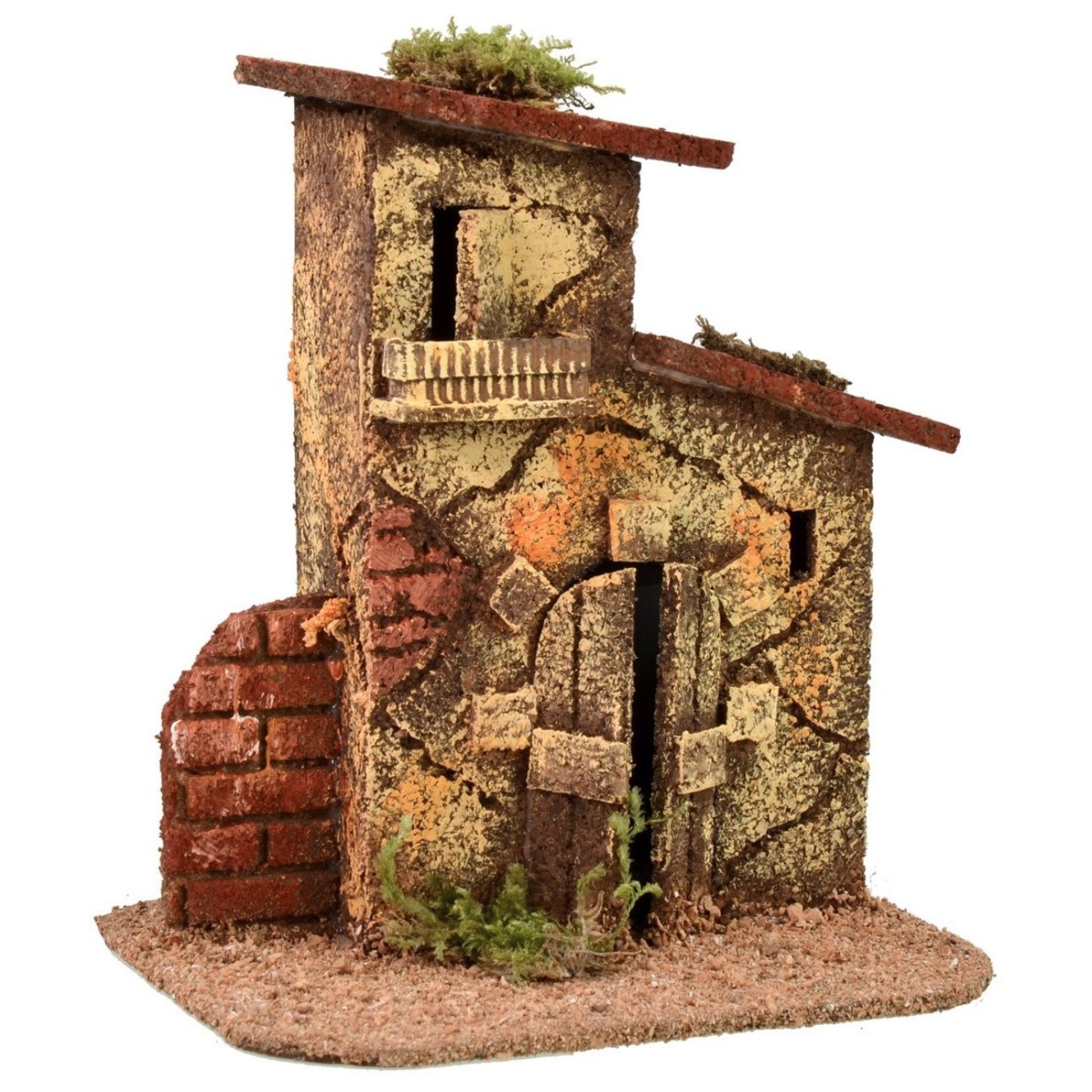 Casa singola disposta su due piani, al piano inferiore notiamo il portone d'ingresso a doppio battente semi aperto, mentre al piano superiore un balcone. L'articolo è realizzato artigianalmente da sapienti mani artigiane utilizzando il legno ed il sughero e dipingendoli a mano. Si consiglia di abbinare il prodotto a statue di altezza 5-6 h cm.
