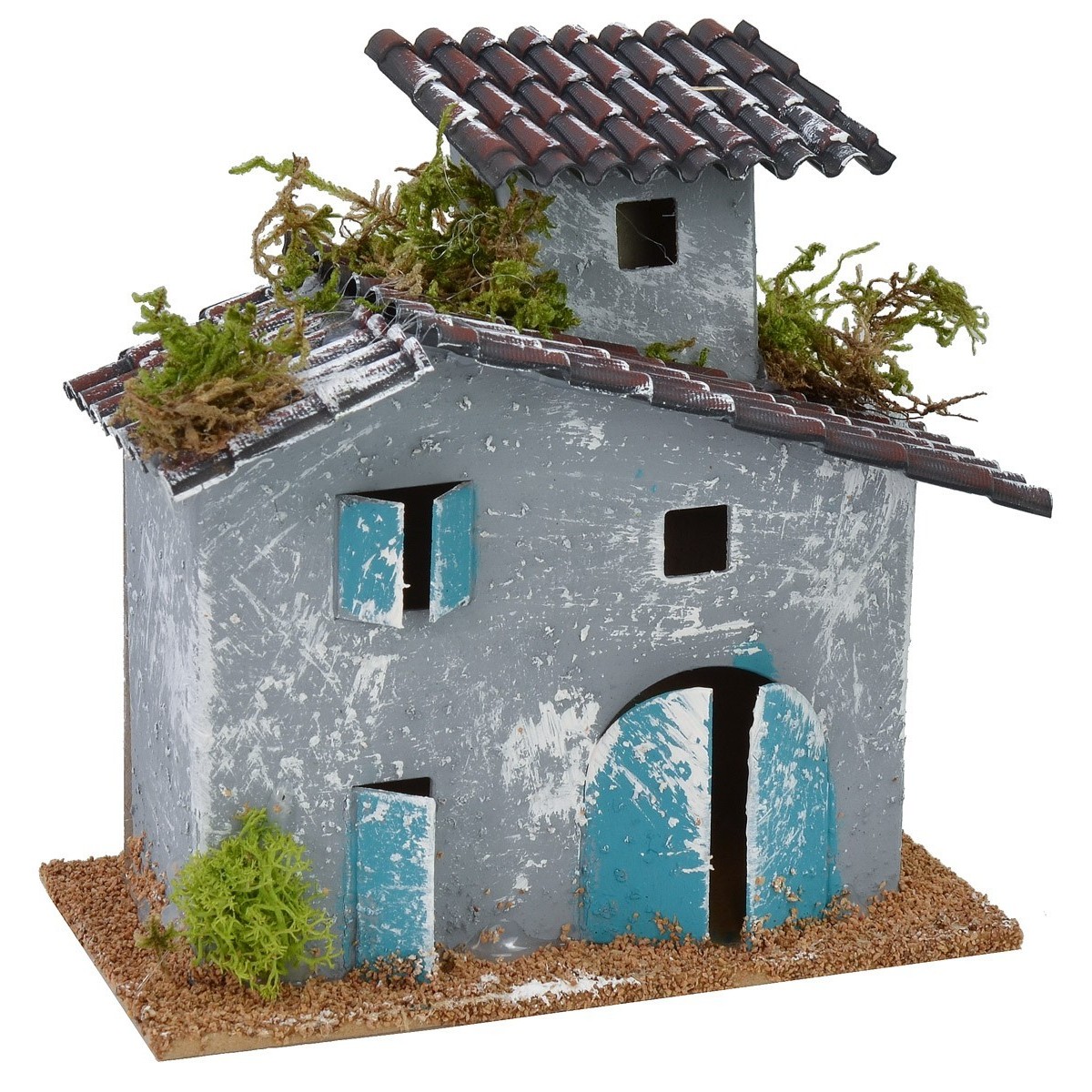 Casetta settecentesca dalle pareti effetto stuccato. L'edificio ha delle finestre, una porta e un portone. La sua caratteristica principale è una torretta che si trova sul lato più spiovente del tetto dell'abitazione. La struttura risulta molto realistica e può essere utilizzata per la creazione del paesaggio in lontananza del presepe. La casa può essere illuminata inserendo delle luci che potete trovare nell'omonima categoria. L'articolo è prodotto artigianalmente in Italia con legno, sughero e vari materiali.