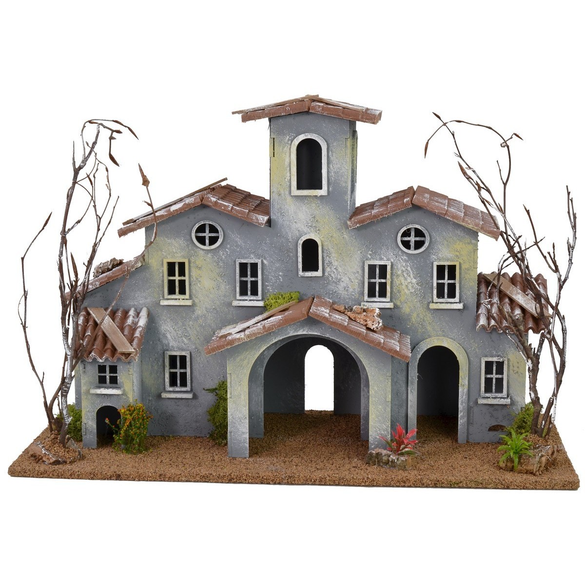 Borgo settecentesco color pastello con l'aia antistante. Sulla facciata dell'edificio vi sono numerose finestre sia tonde che rettangolari. Ai lati sono collocati due alberi privi di foglie e della vegetazione decorativa. L'ambientazione può essere completato con Natività Landi 6-6,5 cm reperibile nei prodotti correlati. I materiali di produzione dell'oggetto sono legno, sughero e muschio.