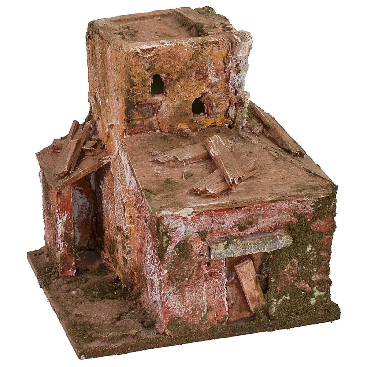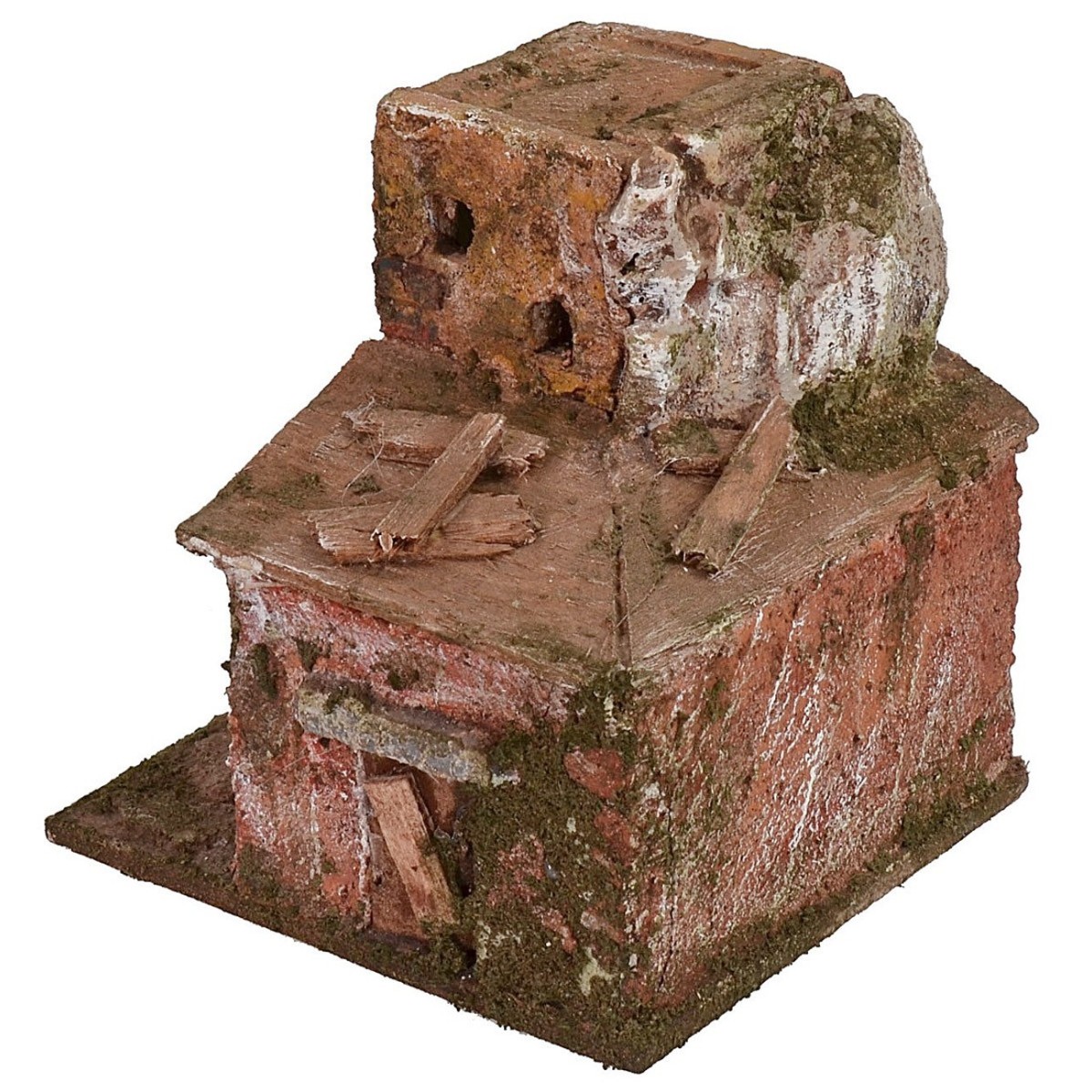 Casa di montagna a due livelli con porticina in legno chiusa e finestrelle al piano superiore mentre a sinistra si trova un piccolo ripostiglio. Il tetto è decorato con alcune vecchie travi di legno. Questa ambientazione è stata creata da artigiani italiani per il Presepe classico popolare in polistirene e legno, ed è adatta a statue di altezza 4 cm. e paesaggi in lontananza.