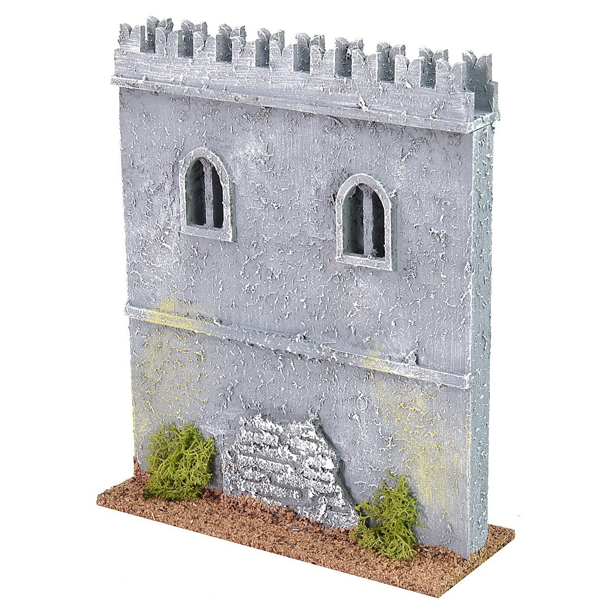 Cinta muraria caratterizzata da un tetto di merli a nido di rondine e da due finestrelle ad arco. Questo articolo vi permetterà di comporre la fortezza perfetta al vostro Presepe in quanto fa parte di una serie componibile per cui troverete gli altri pezzi negli articoli correlati sotto la tabella, è stato prodotto con legno sughero e gesso ed è consigliato per statue di altezza 8-10 cm.