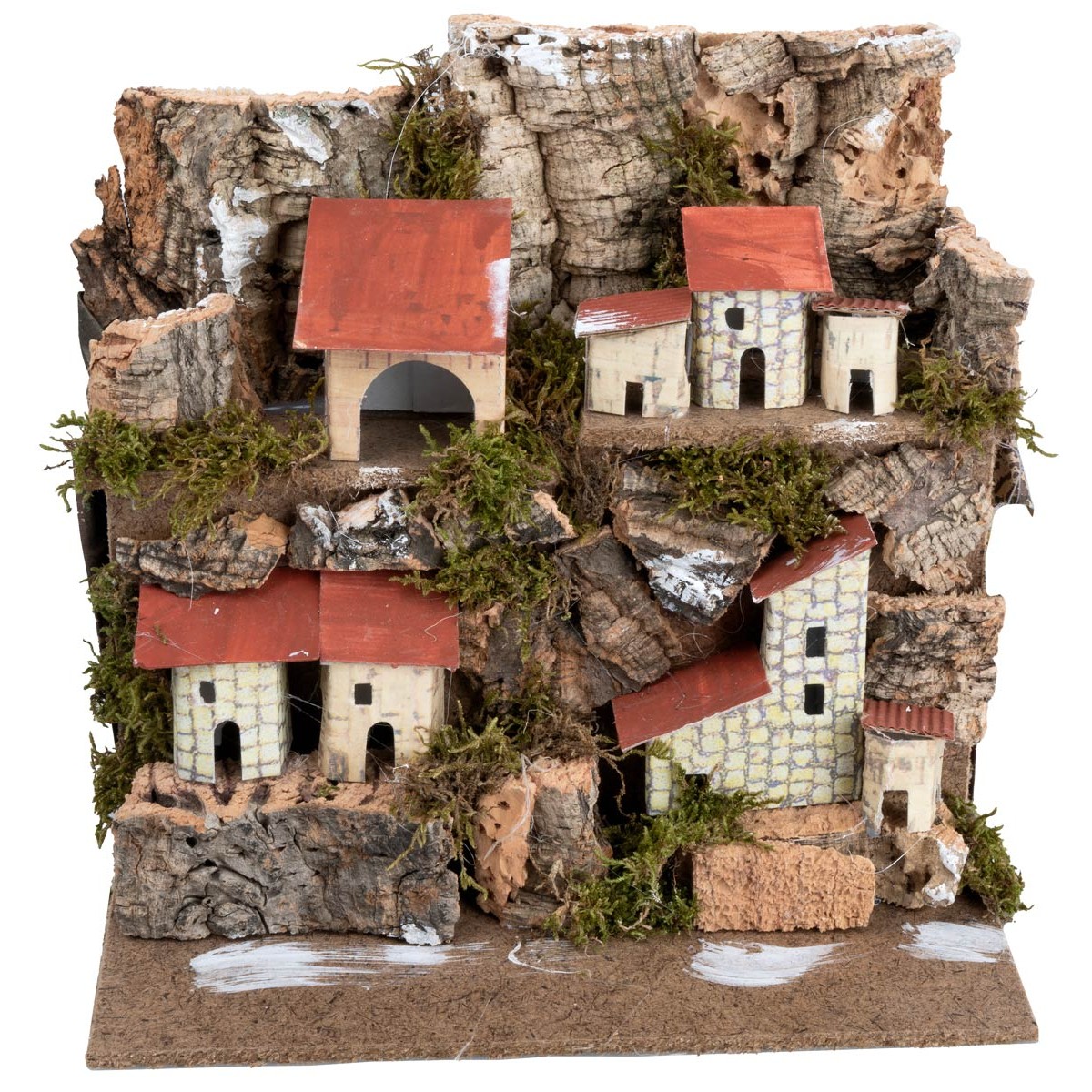 Paesaggio montano con borgo di casette a due livelli, ideale per creare scenografie di paesaggi in lontananza.