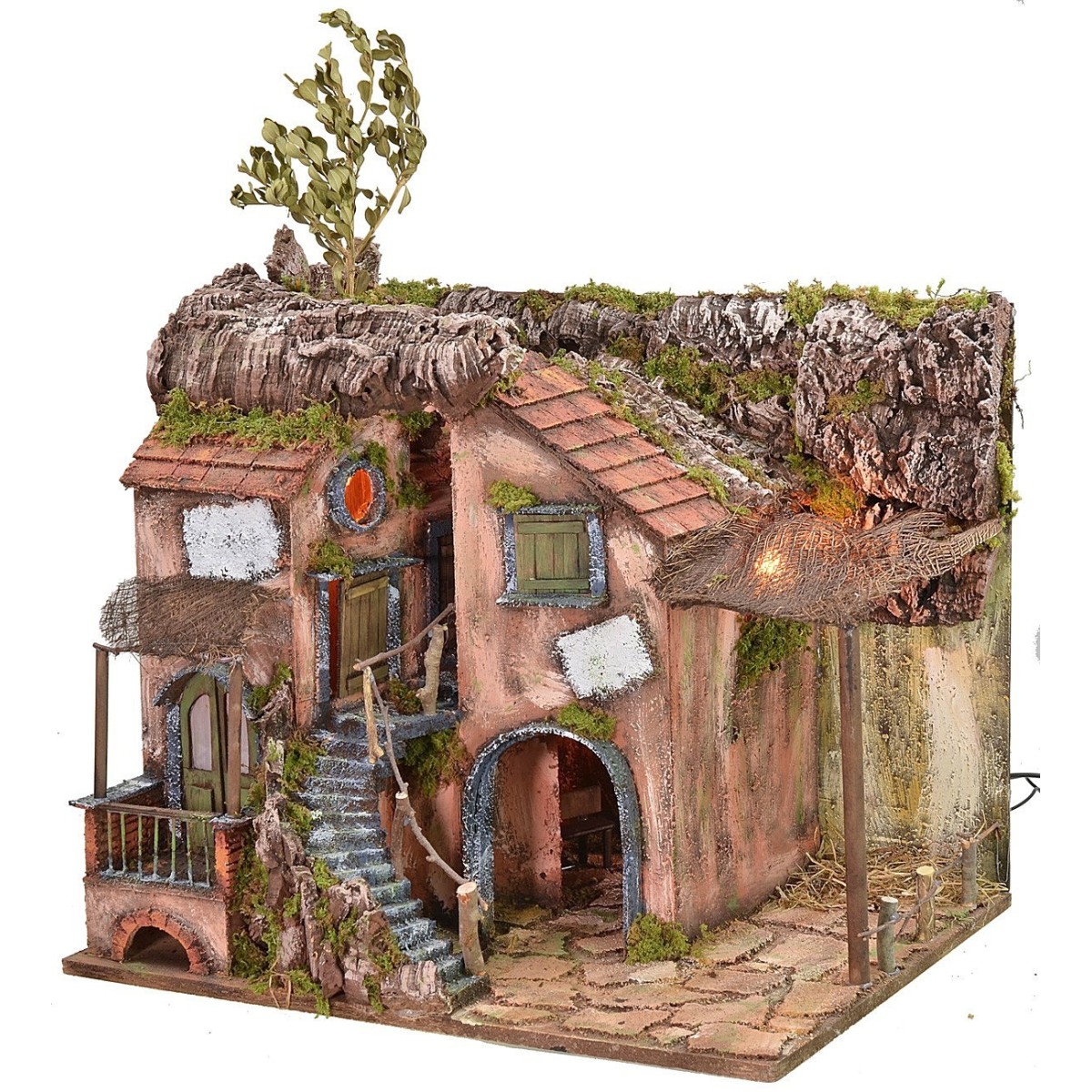 Borgo illuminato molto caratteristico con case dagli infissi verdi e una grande scala al centro che conduce al piano superiore. A sinistra un balconcino, a sinistra un grande arco con specchio effetto profondità dove si vedono una fontana ed un lampione riflessi. A lato una grande pergola in legno dove poter collocare, per esempio, la Natività. Questo articolo è consigliato per statue di altezza 10-12 cm ed è funzionante a corrente.