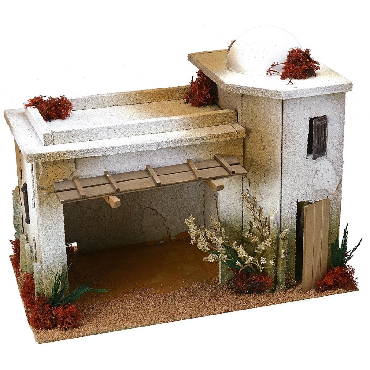 Costruzione in stile palestinese con una bottega da poter allestire a piacimento, la struttura si compone di due edifici bianchi contigui, uno con tetto piano e l'altro con una grande cupola. La scena è colorata grazie ai licheni e alla vegetazione, oltre che dagli infissi in legno. L'ambiente aperto al piano terra potrà essere decorato con statue e minuterie per ricreare delle botteghe artigiane o con banchi colmi di merce da vendere. Questo articolo è stato prodotto in Italia con legno e sughero ed è consigliato per statue di altezza cm 12. Il pezzo può essere illuminato per creare un'atmosfera più suggestiva grazie alle luci disponibili nel nostro negozio tra i prodotti correlati sotto la tabella e può essere arricchito anche con statue in movimento sempre indicate nei correlati.