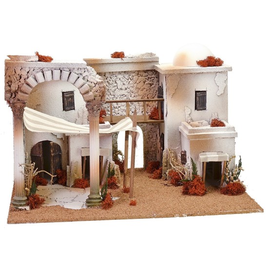 Villaggio palestinese costituito da due grandi abitazioni collegate tra loro da un balcone in legno centrale, le case sono bianche con i classici tetti piani e le cupole. La struttura è ben rifinita con pareti in sughero che riprendono l'effetto della pietra e la scena risulta colorata grazie ai licheni ed alla vegetazione. In primo piano a sinistra un grande arco con un'ampia tenda dove poter, per esempio, collocare la Natività data anche la presenza della paglia. L'articolo è stato prodotto da artigiani italiani con legno e sughero ed è consigliato per statue di altezza 10 cm. La scena può essere illuminata con luci che troverete nei prodotti correlati sotto la tabella.