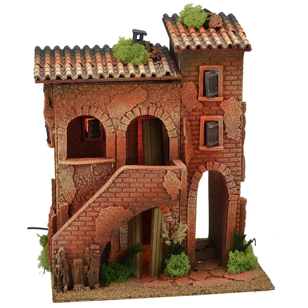 Casa illuminata per Presepe con una scalinata che conduce al piano superiore dov’è presente un porticato ad archi; al piano terra un grande portone in legno a due battenti affiancato dal doppio arco che permette di accedere al cortile. L’abitazione risulta minuziosamente rifinita nei particolari come, per esempio, l’illuminazione, i decori delle pareti e la vegetazione. Questo articolo per presepe è funzionante a corrente e consigliato per statue di altezza 10-12 cm. Il prodotto è stato realizzato artigianalmente in Italia con legno, sughero e lichene.