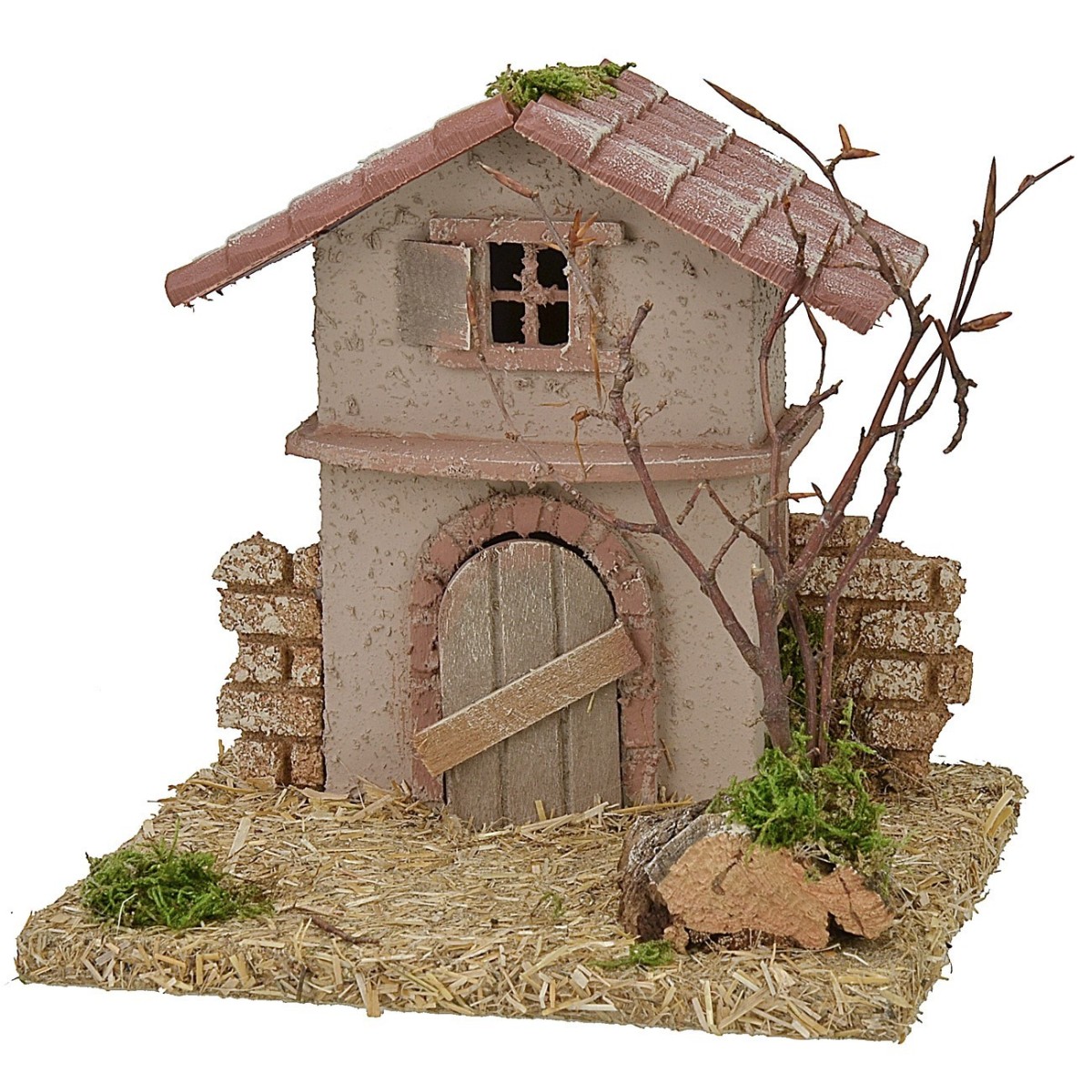 Casa rustica di campagna con tetto spiovente, al piano inferiore un portone in legno semiaperto, mentre al primo una finestra quadrata e la scena è arricchita da un albero. Il prodotto è consigliato per statuine di altezza 5-6 cm ed è stato realizzato artigianalmente in Italia con legno, sughero, muschio e pvc.