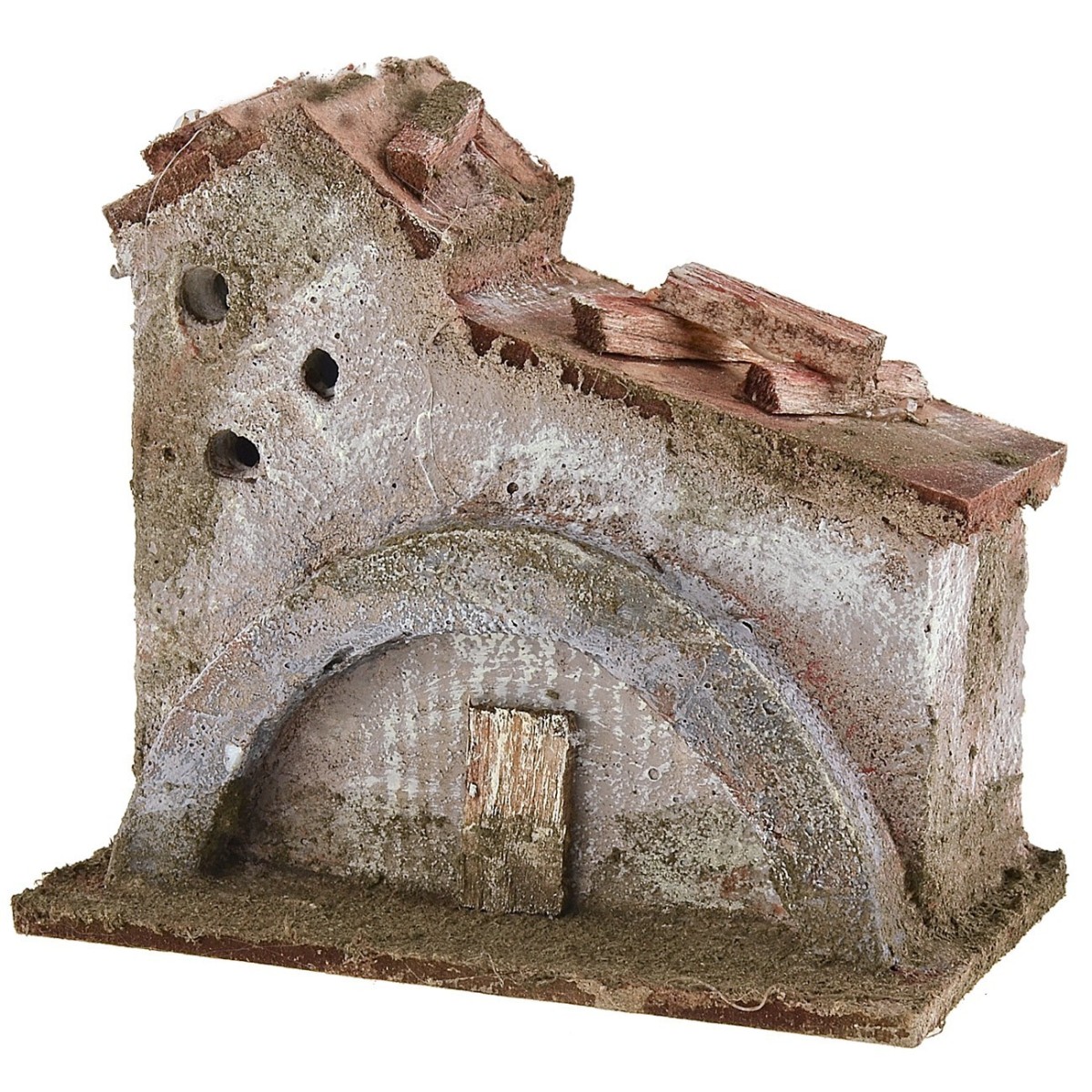 Casa di campagna con porticina al centro di un arco cieco e finestrelle tonde al piano superiore. Il tetto è decorato con alcune vecchie travi di legno. Questa ambientazione è stata creata da artigiani italiani per il presepe classico popolare in polistirene e legno, ed è adatta per paesaggi in lontananza.