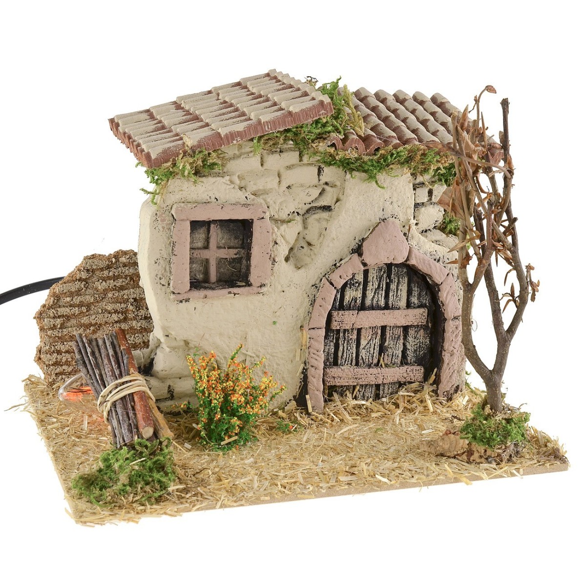 Casetta per presepe con fuoco effetto fiamma funzionante a corrente. Edificio rustico con pareti stuccate ed un portone a ad arco. L'ambientazione è caratterizzata dalla presenza a sinistra di una fascina di legna infuocata ed illuminata con una luce tremolante che riproduce fedelmente la fiamma. Questo accessorio per presepe è adatto a statuine di altezza 6-8cm ed è stato realizzato artigianalmente in Italia con legno, sughero e pvc.