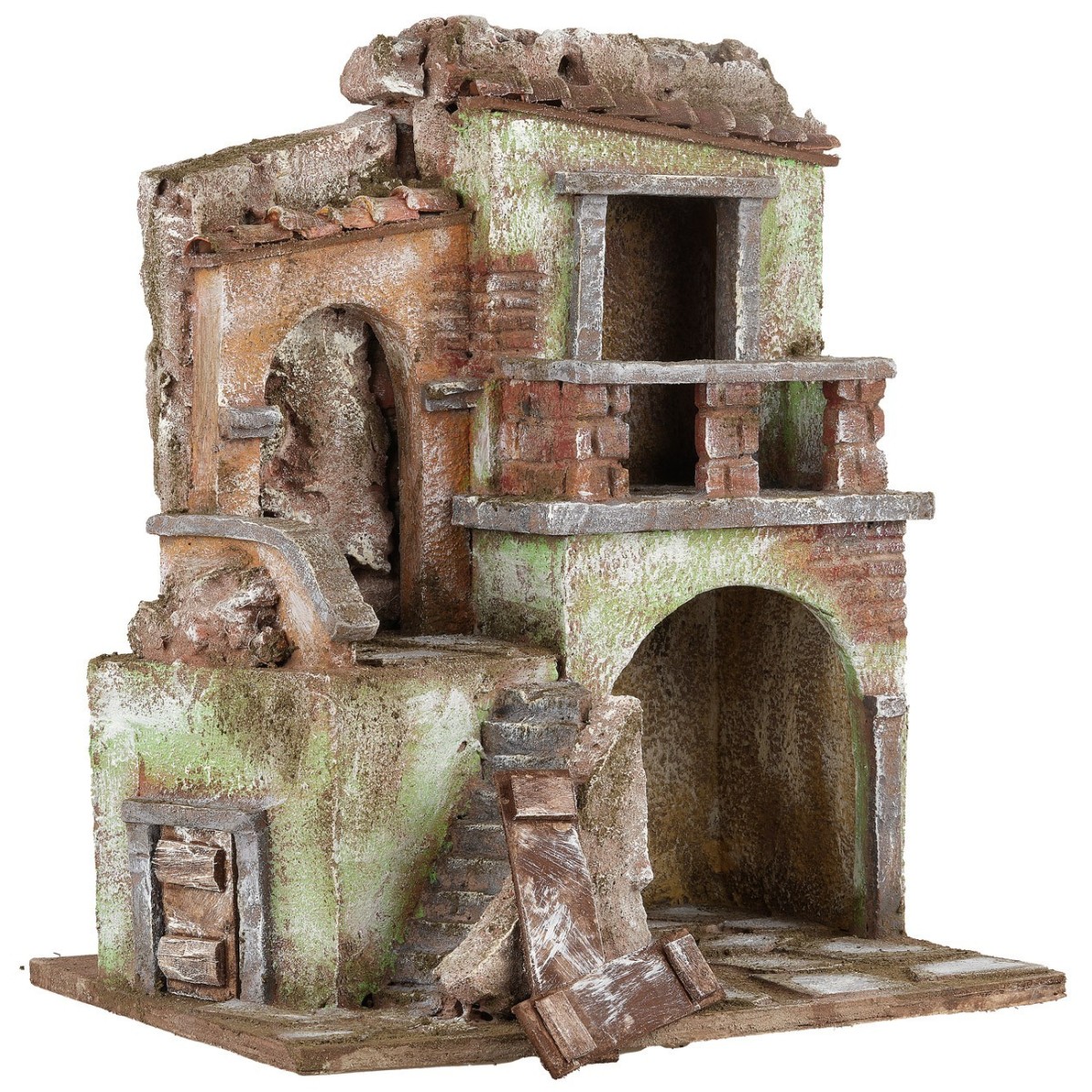 Gruppo di case, in un unico blocco, ideale per creare la città del presepe fai da te. La scenografia rappresenta una tipica composizione di case rustiche. Al piano inferiore c'è la possibilità di allestire il vano, mentre al piano superiore troviamo il pianerottolo della scala, che serve per salire, e il balcone. Si consiglia l'utilizzo con statue di altezza 8-10 cm. Si precisa che le figure inserite sono solo a scopo dimostrativo e non sono incluse, ma sono disponibili nei prodotti correlati. Il prodotto è interamente realizzato a mano in Italia con legno e polistirene, di conseguenza può mostrare leggere differenze dalle fotografie.