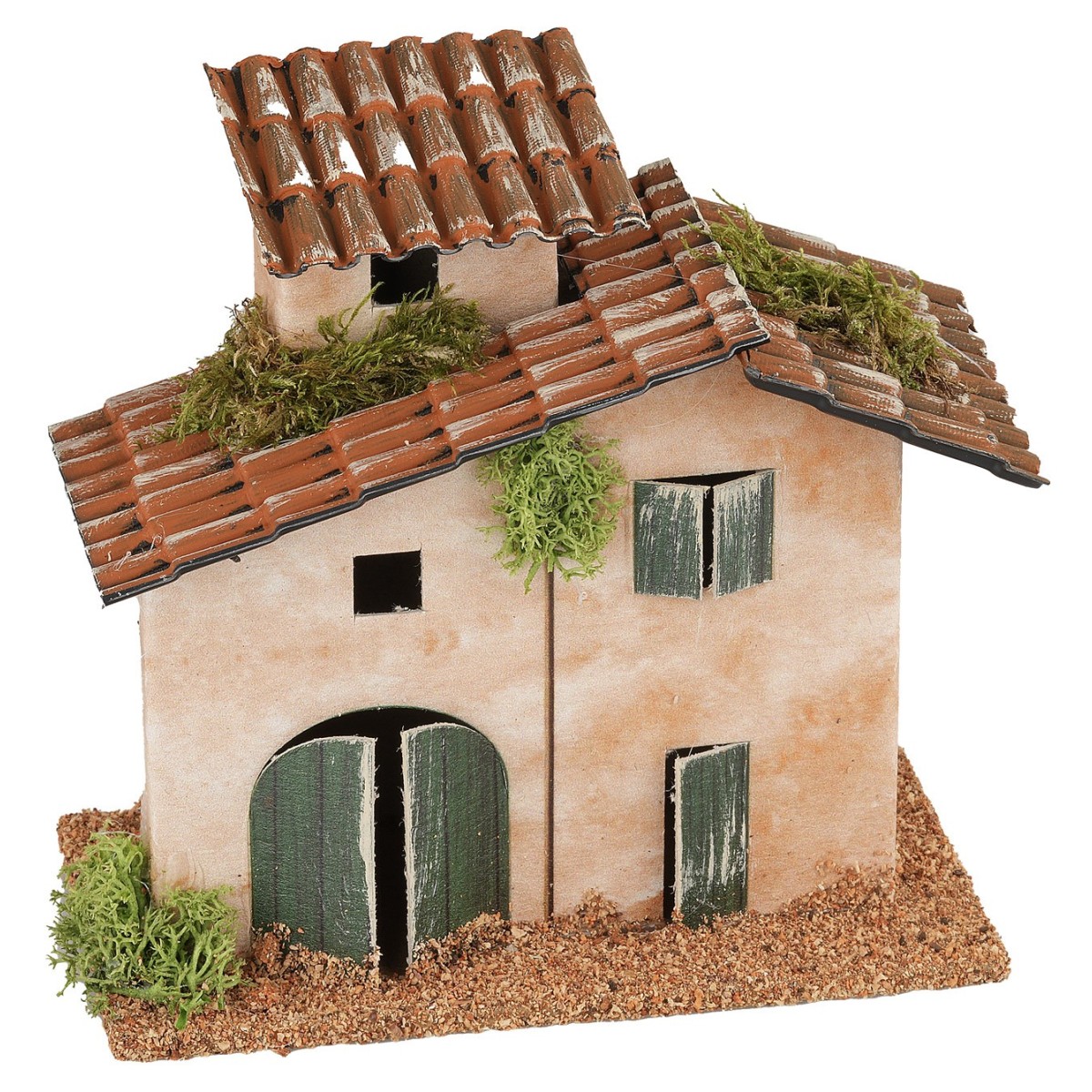 Casetta di campagna con finestre e porte, con dettagli in muschio. Il prodotto è realizzato in Italia in legno, sughero e muschio. Si consiglia l'utilizzo per la creazione di paesaggi in lontananza.