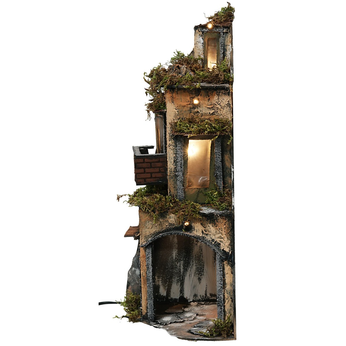 Borgo illuminato in stile napoletano la sua forma a 90° con base semicircolare permette di collocarlo, per esempio, negli angoli del presepe. Al piano inferiore è presente una porta verde affiancata da un grande arco aperto dov'è possibile collocare la Natività o allestire delle botteghe, in quelli superiori si trovano delle portefinestre con ampie vetrate di cui una si affaccia su un grazioso balconcino. L'illuminazione è funzionante a corrente e questo edificio è stato realizzato artigianalmente in Italia con legno, sughero e muschio. L'articolo è consigliato per statue di altezza 10 cm e nei dettagli del prodotto sono disponibili tutte le informazioni relative alle statue da poter abbinare.