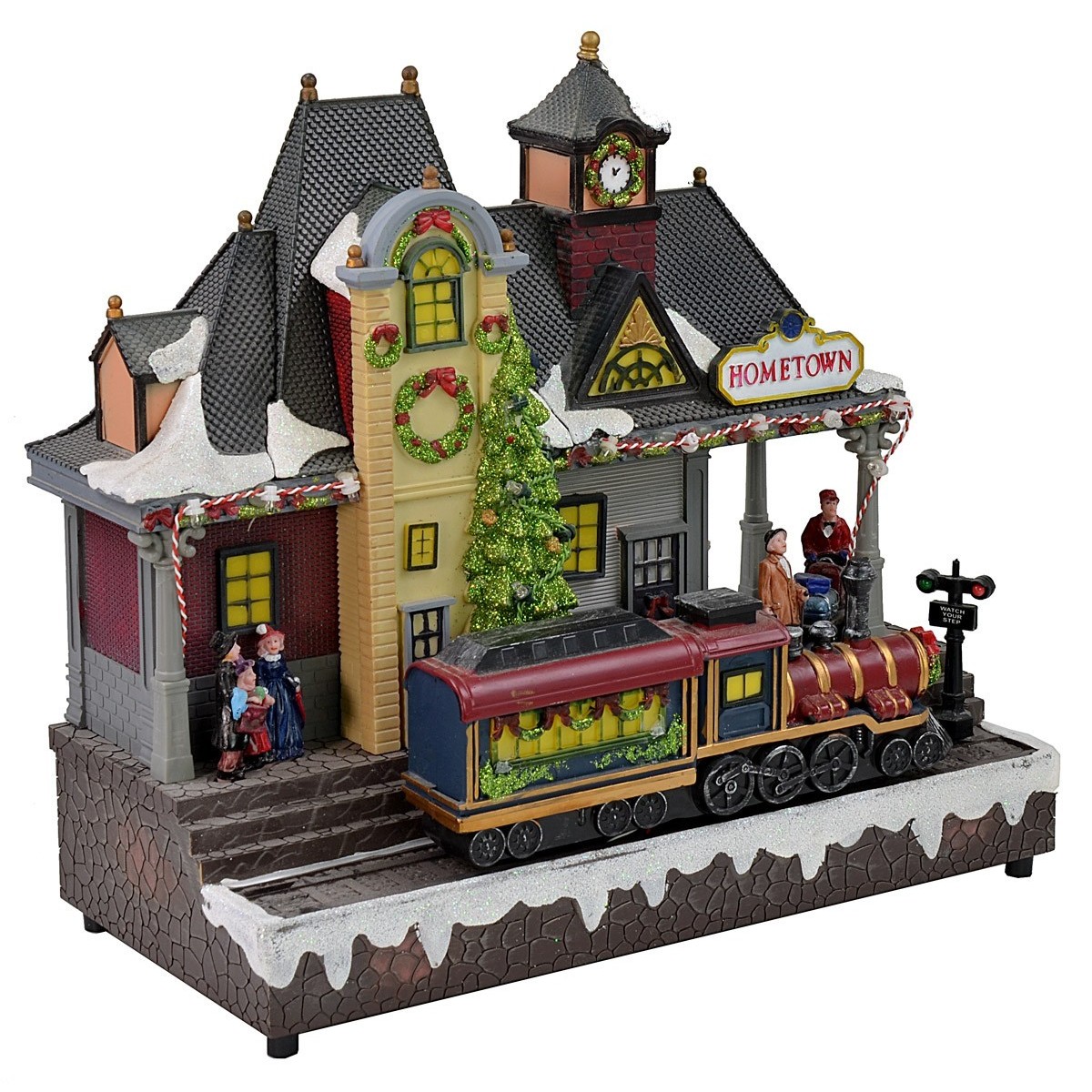 Scenografia natalizia cm 31,5x15x30 h raffigurante una stazione ferroviaria con treno in movimento e 7 personaggi. L'articolo prevede due modalità di funzionamento: possono essere attivati solo il movimento e le luci, oppure è possibile attivare sia il movimento e le luci che la musica. Il prodotto è funzionante tramite batterie NON incluse nell'acquisto ed è realizzato in plastica e resina.