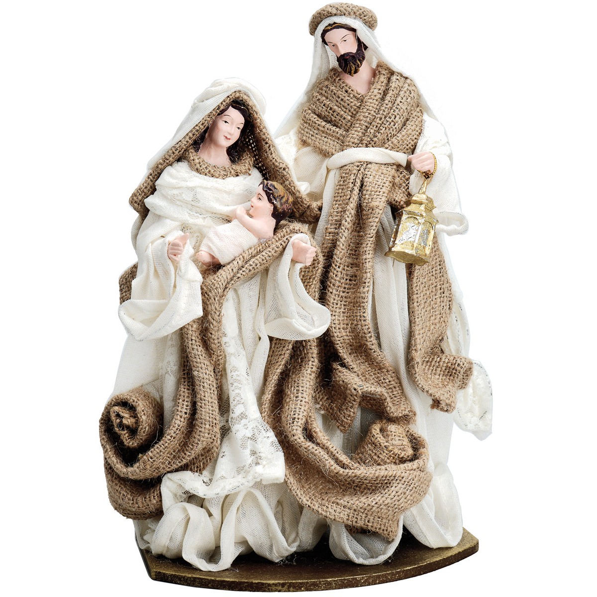 La scena raffigura Maria, Giuseppe e il Bambino Gesù in un’unica composizione, caratterizzata da vesti in tessuto di juta e cotone bianco che donano un effetto naturale e armonioso. Ideale come elemento centrale del presepe o come decorazione natalizia.