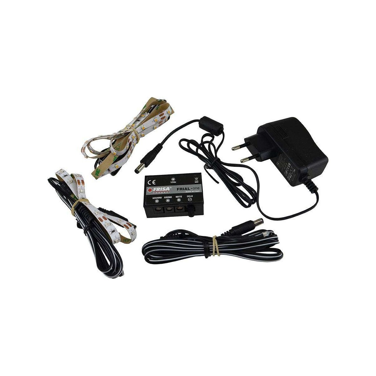 La centralina ha in dotazione l'alimentatore, una striscia Led azzurra serie "PS" da 30 led cm 50, 2,4W (effettivi) pari a una lampada da 16W + una striscia led bianco caldo serie "PS" da 60 led cm 100, 4,8 (effettivi) e un led fuoco tremolante, il necessario per l'illuminazione del presepe.