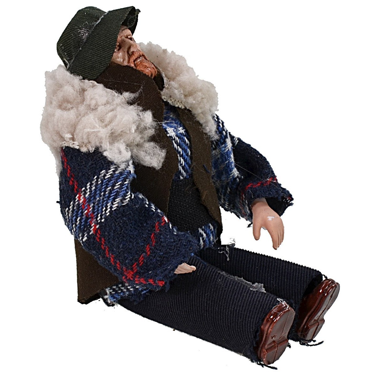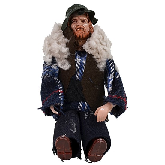 La statua rappresenta un uomo vestito in abiti pesanti, con una pelliccia e un cappello di colore scuro, seduto con le gambe distese davanti a sé. L'articolo è in stile Napoletano e realizzato in terracotta vestita. Essendo prodotto artigianalmente possono variare leggermente i colori.
