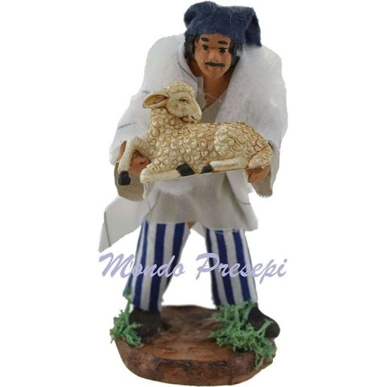 Uomo con pecora in braccio cm 10, in terracotta vestito in tessuto.