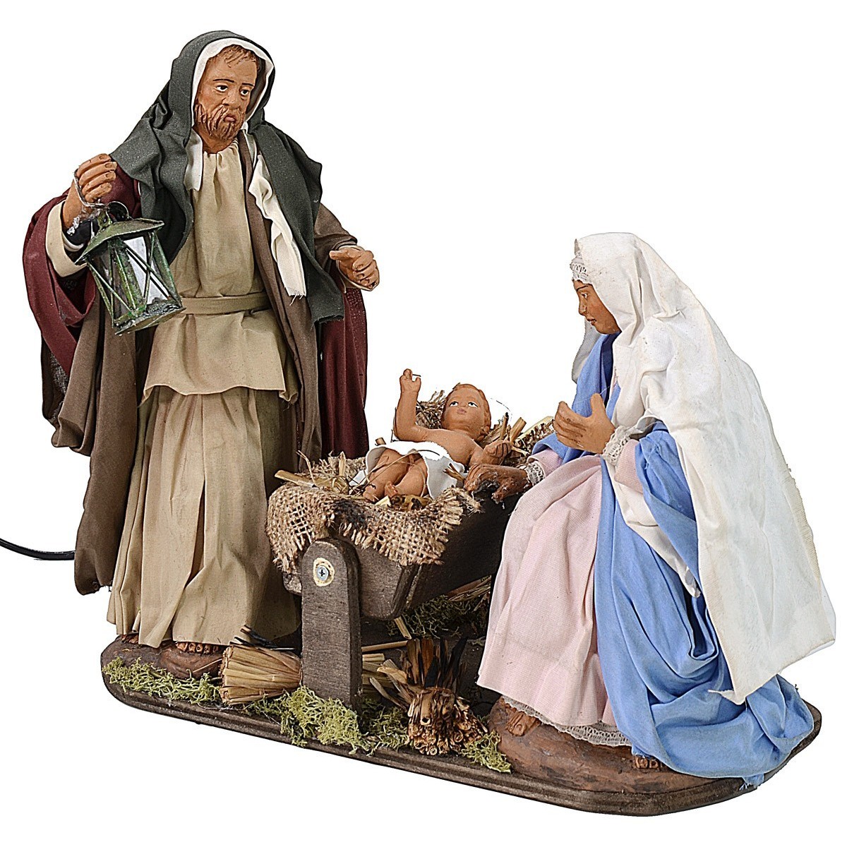 Natività in terracotta serie cm 24 con base, Giuseppe muove il braccio con cui regge la lanterna illuminata, mentre Maria muove la culla con Gesù. La scena risulta ben rifinita e molto suggestiva con la luce della lanterna, mentre le statue sono caratterizzate da volti espressivi e abiti in tessuto induriti. L'articolo funzionante a corrente è stato realizzato da artigiani italiani.