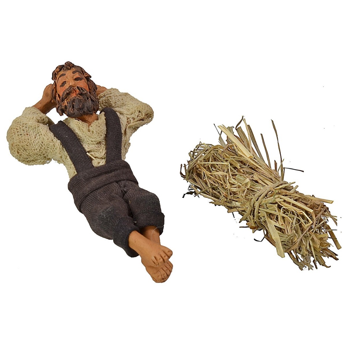 Pastore che riposa disteso sul fieno. La statua è in terracotta ben rifinita nei minimi particolari con abiti in tessuto indurito, essendo realizzato completamente a mano possono variare leggermente i colori dei vestiti e del viso rispetto alla foto. Prodotto artigianale realizzato dai migliori artisti italiani.