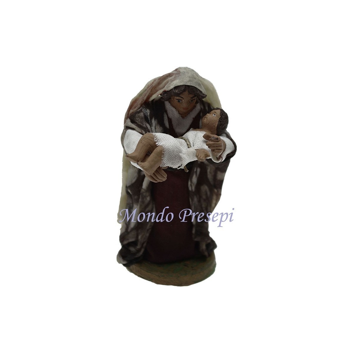 Mamma con bimbo in braccio, statua in terracotta artistica rifinita nei particolari e vestita con tessuto indurito.
