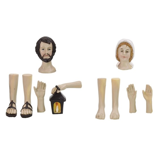 Set composto da testa, mani e piedi Natività (San Giuseppe con lanterna, Madonna) per creare statue fai da te di altezza da 12 a 15 cm. Nella categoria del prodotto è possibile trovare il manichino da associare al kit.