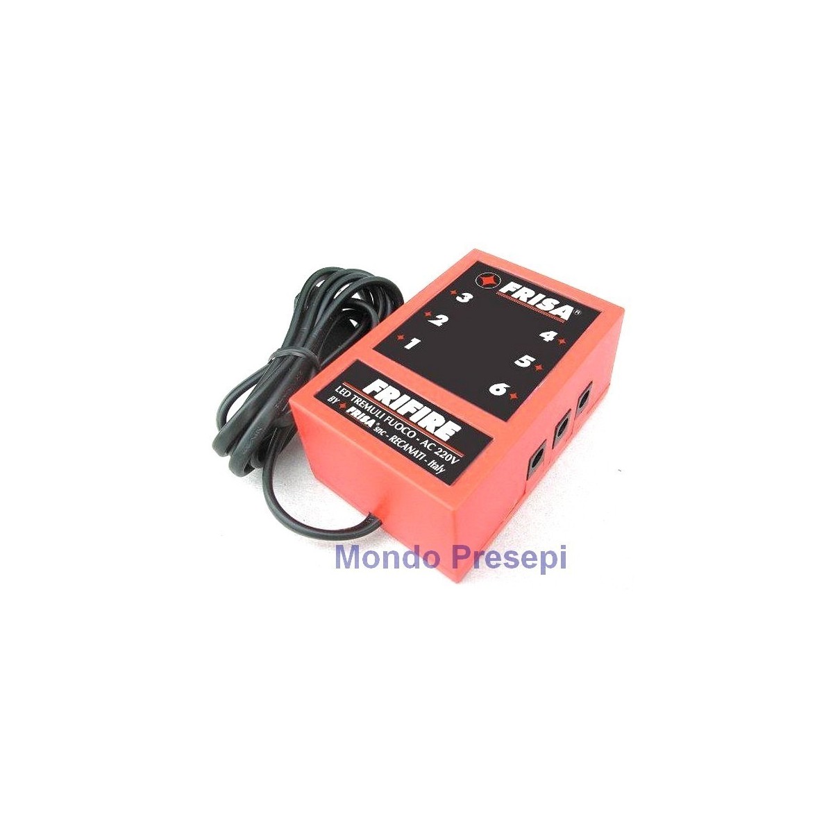 Alimentatore a 6 uscite. Possono essere ad esso collegati da 1 a 6 Led. I led collegati alle varie uscite produrranno luci tremule diverse fra di loro (ovviando così al brutto effetto lampeggiante causato da luci tremule con la stessa vibrazione).