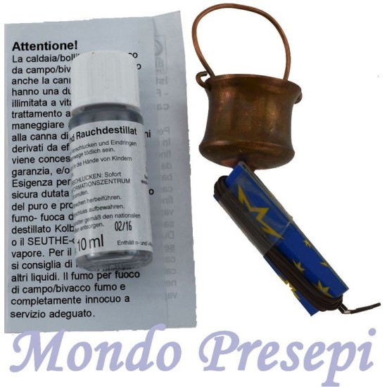 Il kit è composto da un flacone ml.10 di liquido fumogeno e da un pentolino in rame dal diametro di cm 2,6cm. Il tegame può esser collocato direttamente sui fuochi per fare l'effetto fumo che esce dalla pentola oppure inserito nei comignoli. Nel set è inclusa anche una spinetta necessaria per collegare il pentolino al portapile o all'alimentatore con multipresa. Se, invece, si volesse collegare il pentolino ad un normale alimentatore, si dovrà sostituire la spinetta con un morsetto e basterà collegare le due estremità dei cavi.
