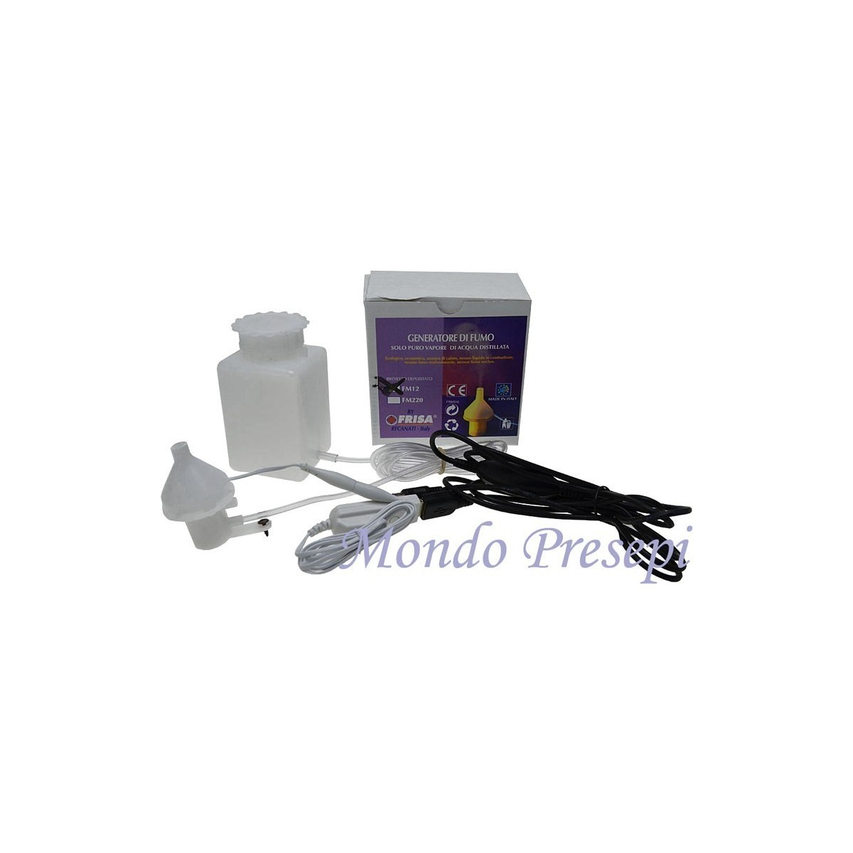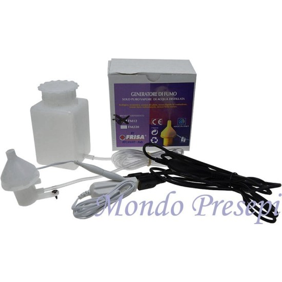 Sistema sicuro ed ecologico, utilizzabile anche in ambienti chiusi e privi di areazione perché non riscalda ed è inodore. Il prodotto funziona con acqua distillata e genera un fumo di vapore acqueo, è fornito completo di alimentatore e di un serbatoio con relativo tubo di collegamento. La capienza massima del serbatoio è di 125ml.