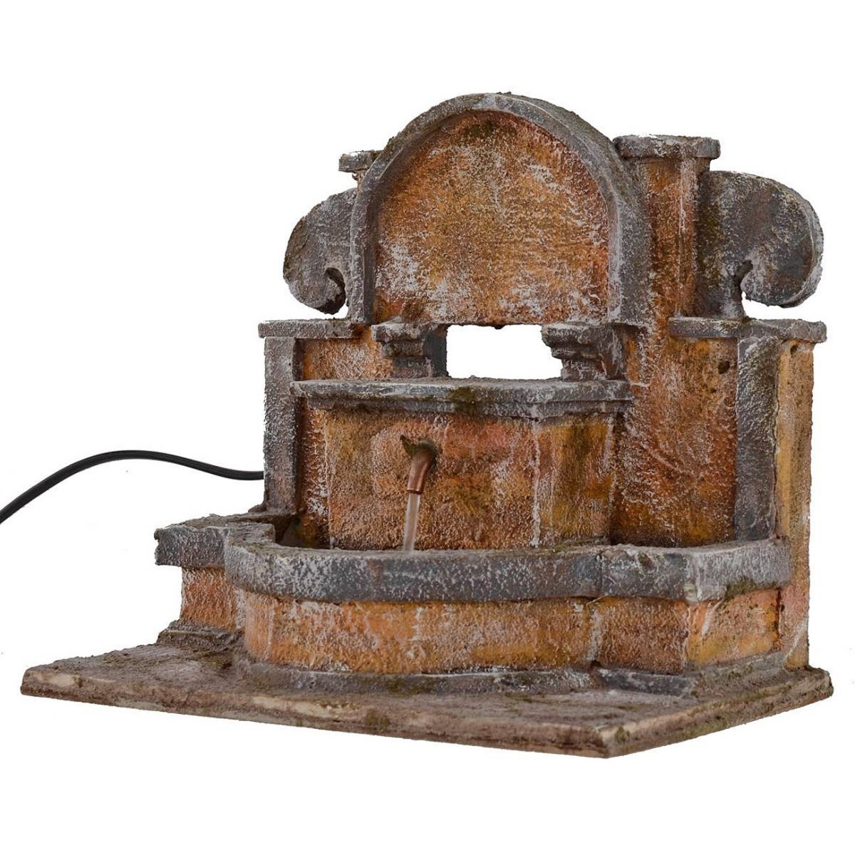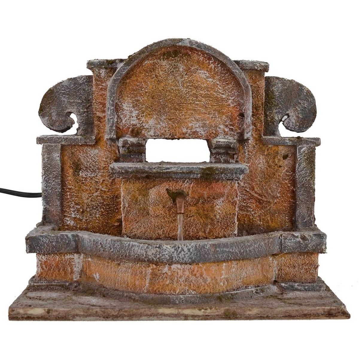 Fontana completa di pompa funzionante a corrente. La struttura presenta delle eleganti decorazioni come archi e greche, rendendo la fontana molto importante. La vasca, dalla forma a semicerchio, si allarga ai lati. Sulla parete della vasca si trova il beccuccio in rame da cui sgorga l'acqua. L'articolo è prodotto in polistirene e legno da sapienti mani artigiane italiane per il Presepe classico popolare ed è consigliato per statue di altezza da 10 a 12 cm.