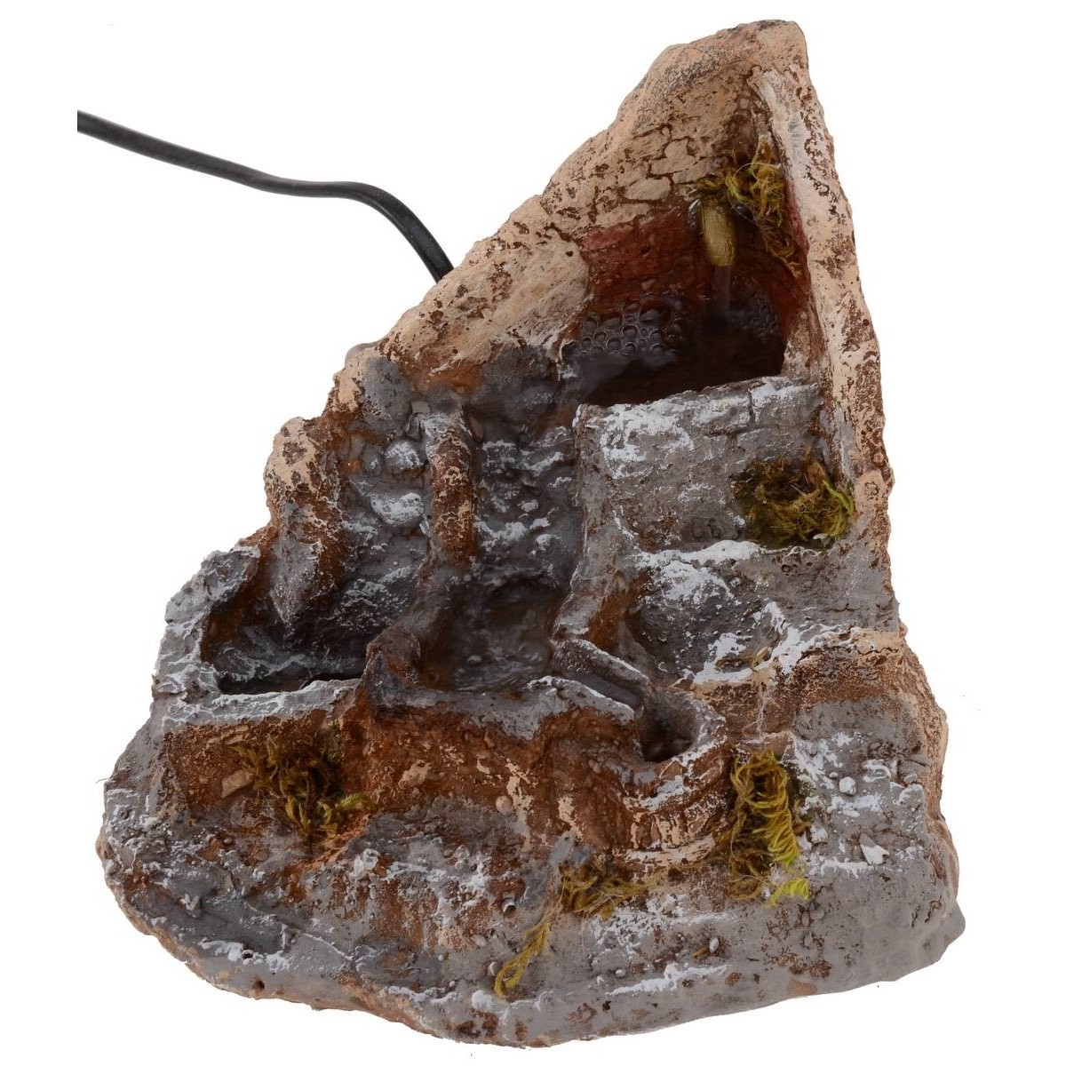 Ruscello con fontana funzionante in resina, completa di pompa funzionante a corrente. La struttura presenta un ambiente prevalentemente naturale grazie all'utilizzo della resina effetto pietra. Dalla piccola vasca di una fontana decadente dotata di un beccuccio in rame soprastante, l'acqua sgorga verso il basso, percorrendo un percorso roccioso, simile ad un ruscello, che rende la scenografia molto suggestiva. L'articolo è prodotto interamente in resina da sapienti mani artigiane italiane per il Presepe classico popolare ed è consigliato per statue di altezza 8-10 cm.