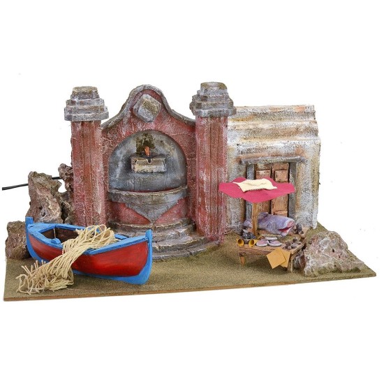 Ambientazione con fontana funzionante a corrente, barca da pescatore e bancarella del pesce cm 49x27x25 h