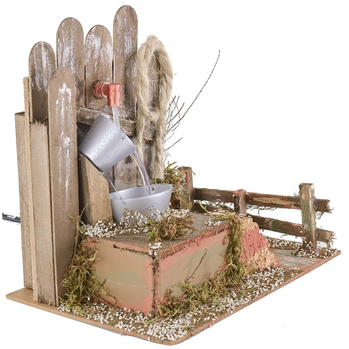 Fonte d'acqua che sgorga da una parete in legno e scorre verso un secchio inclinato che va ad alimentare una tinozza, questo crea un delizioso gioco d'acqua. La scena è ricca di tanti altri particolari come la corda appesa, la pianta secca a fianco, la staccionata a destra. L' ambientazione è completa di pompa funzionante a corrente, è consigliata per statue di altezza da 12 a 15 cm ed è stata realizzata con legno sughero e muschio.