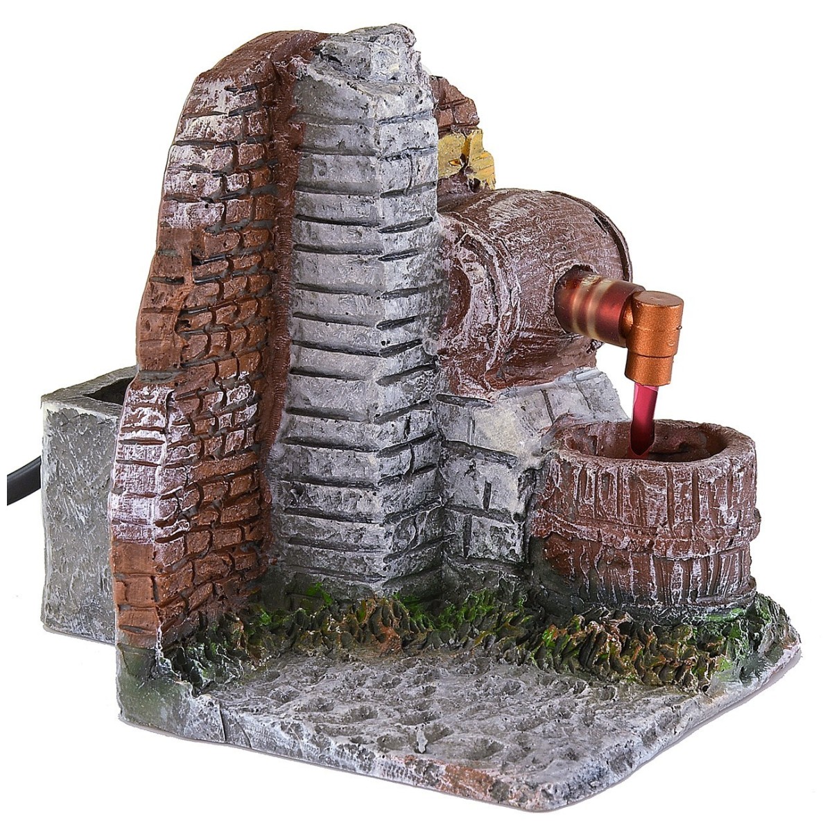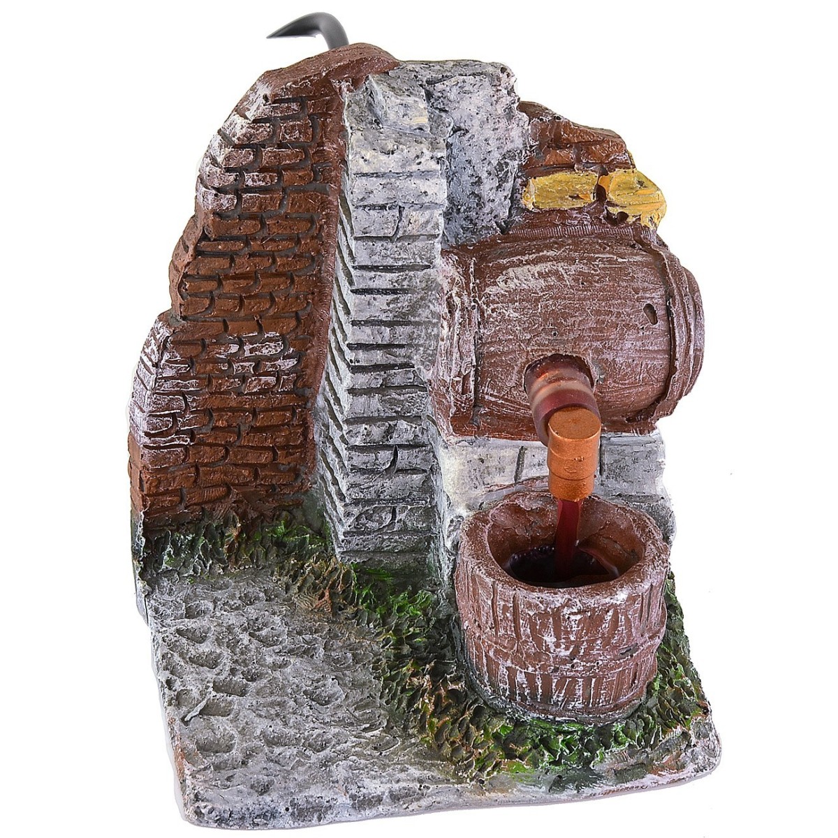 Scenografia per presepe in resina con botte funzionante a corrente. Vicino ad una parete di mattoni, sopra ad un muretto in pietra si trova una botte al cui centro è posizionato un rubinetto da cui sgorga del vino che viene raccolto nella tinozza sottostante. Questo articolo è consigliato per statuine di altezza da da 8 a 10 cm ed è già completo di pompa per il riciclo d'acqua continuo. Per riprodurre il colore del vino è possibile utilizzare il colorante alimentare disponibile in quasi tutti i supermercati.