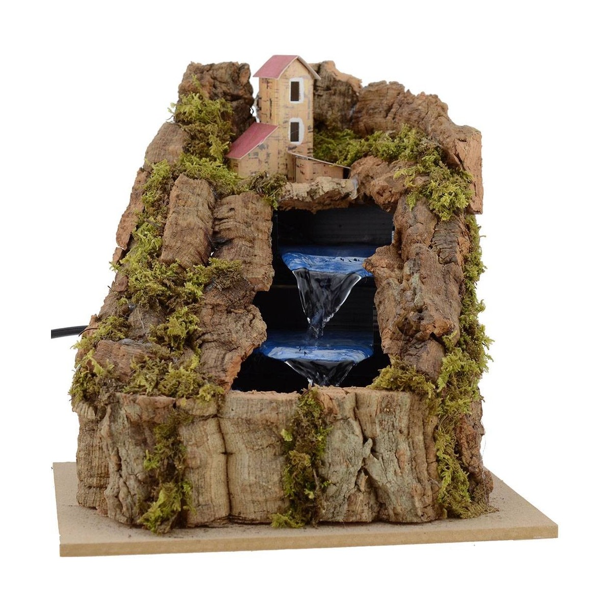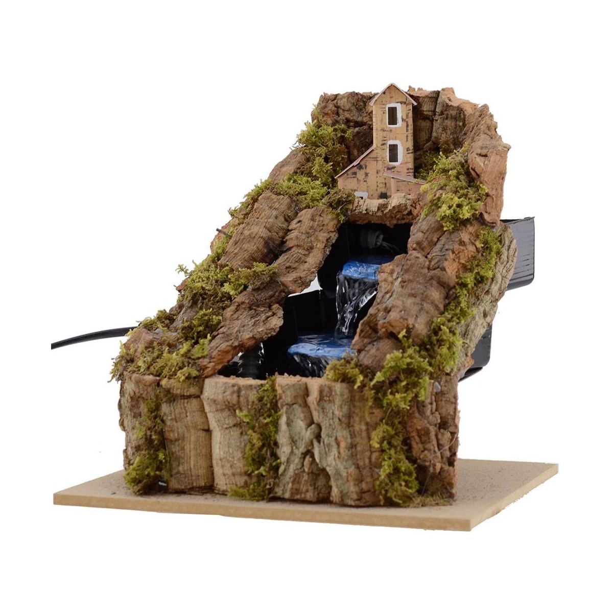 Cascata a sbalzi sulle montagne, completa di pompa funzionante a corrente, realizzata artigianalmente in legno sughero e muschio.