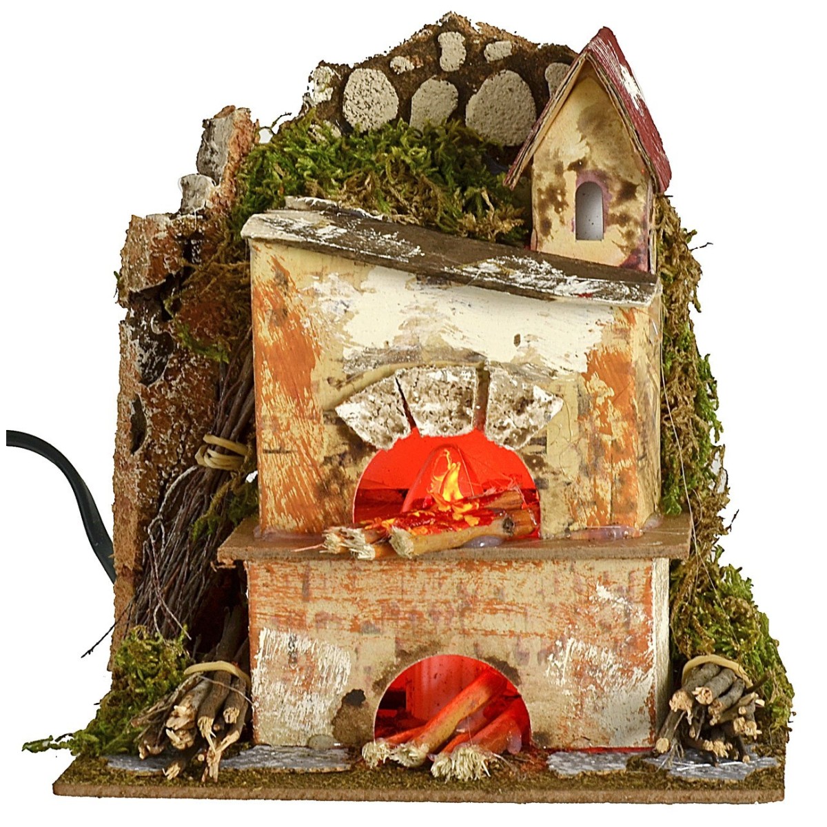 Forno a tre piani, in quello inferiore è riposta la scorta di legna, al centro è posto il forno completo di luce effetto fuoco funzionante a corrente e decorato dalla legna che sta ardendo; il tutto sovrastato da un piccolo camino che spunta a destra. La scena è consigliata per statue di altezza 8-10 cm ed è rifinita con sughero effetto pietra, muschio e fascine di legna.