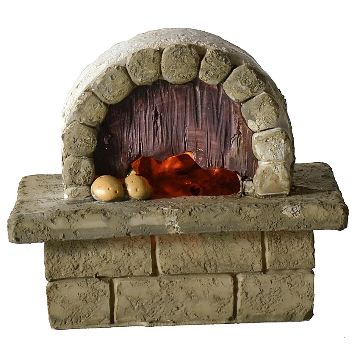 Forno con struttura tonda in resina per panettiere o pizzaiolo, completo di fuoco a led pulsante funzionante a batterie LR44x2 incluse. Il prodotto è ideale per arricchire la scenografia del Presepe ed è consigliato per statuine di altezza 8-10 cm Landi Moranduzzo. Sotto la base è presente il vano porta batterie con interruttore per l'accensione e lo spegnimento della luce.