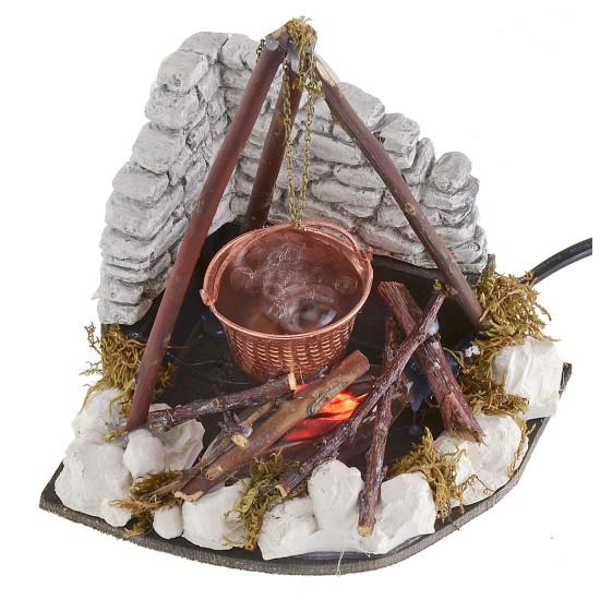 Bivacco tra due pareti in pietra e delimitato davanti da massi bianchi, davanti delle fascine di legna da cui fuoriesce la luce effetto fiamma del fuoco. In centro è appeso il paiolo in rame con effetto bollitura. La scena per presepe funziona a corrente e l'effetto bollitura è prodotto da una pompa a ossigeno inclusa. L'articolo è consigliato per statue di altezza 15-20-24 cm ed è stato realizzato da artigiani italiani.