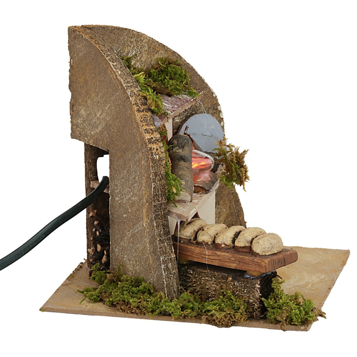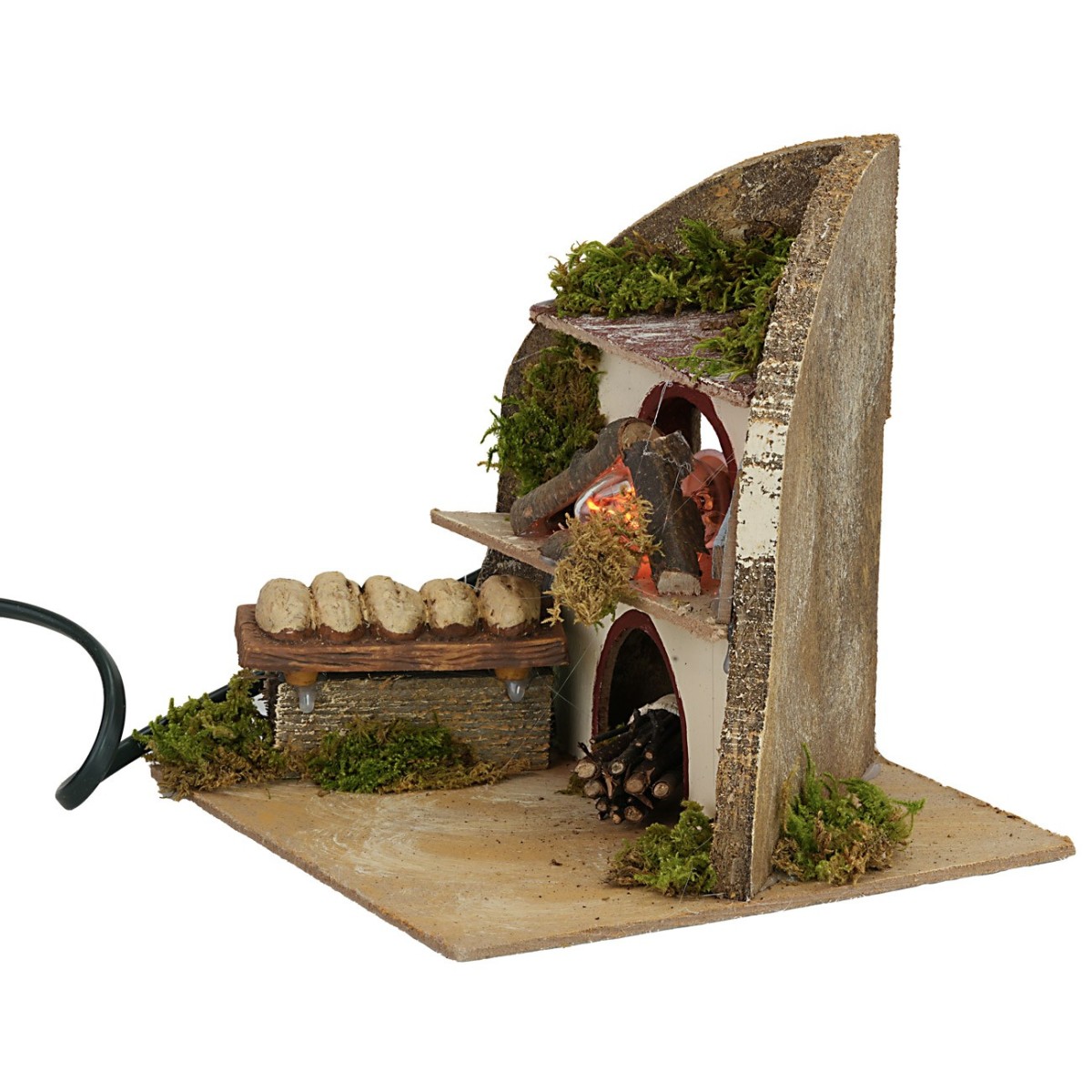 Forno a tre piani, in quello inferiore è riposta la scorta di legna e del pane, al centro troviamo il forno completo di luce effetto fuoco funzionante a corrente circondato da della legna. È consigliato per statue di altezza da 8 a 10 cm. La sua realizzazione in materiali naturali come legno, sughero e muschio, e il fatto che sia fatto a mano in Italia, lo rende un pezzo importante per arricchire un presepe.