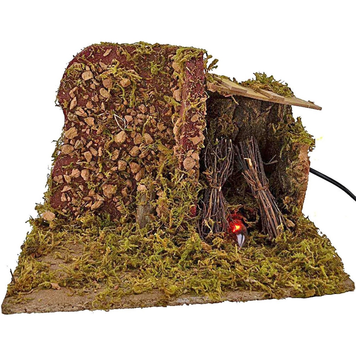 Fuoco funzionante a corrente, con ambientazioni realizzata in legno, sughero e muschio.