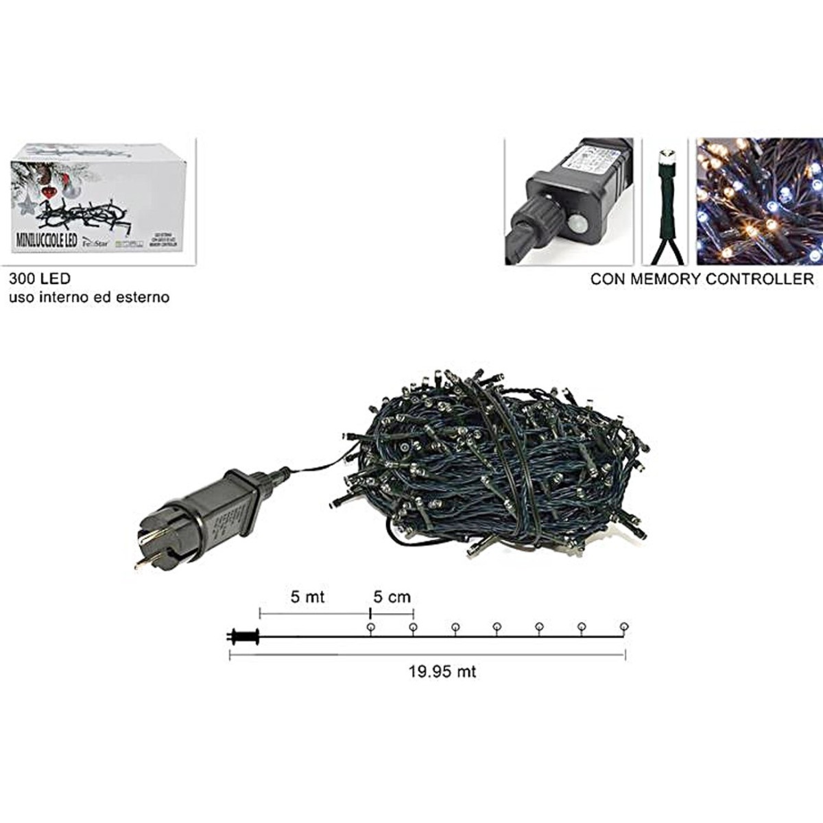 Catena con 300 mini lucciole led bianco caldo e freddo lunga 19,95 metri, è adatta per ambienti esterni. Ogni led ha una distanza di 5 cm ed completa con giochi d luce.