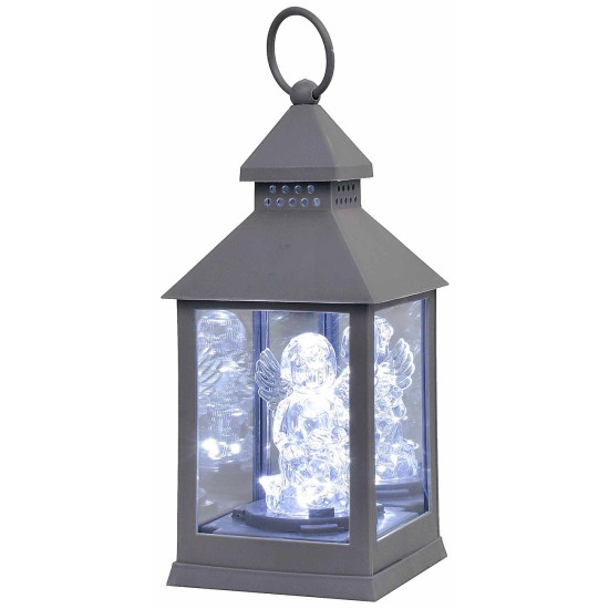 Lampada di cole grigio con angelo inginocchiato illuminato a led luce fredda fissa, funzionante a batterie (incluse e sostituibili) dalla durata stimata in 90 giorni. All'interno della lanterna uno specchio riflette le ali dell'angelo.