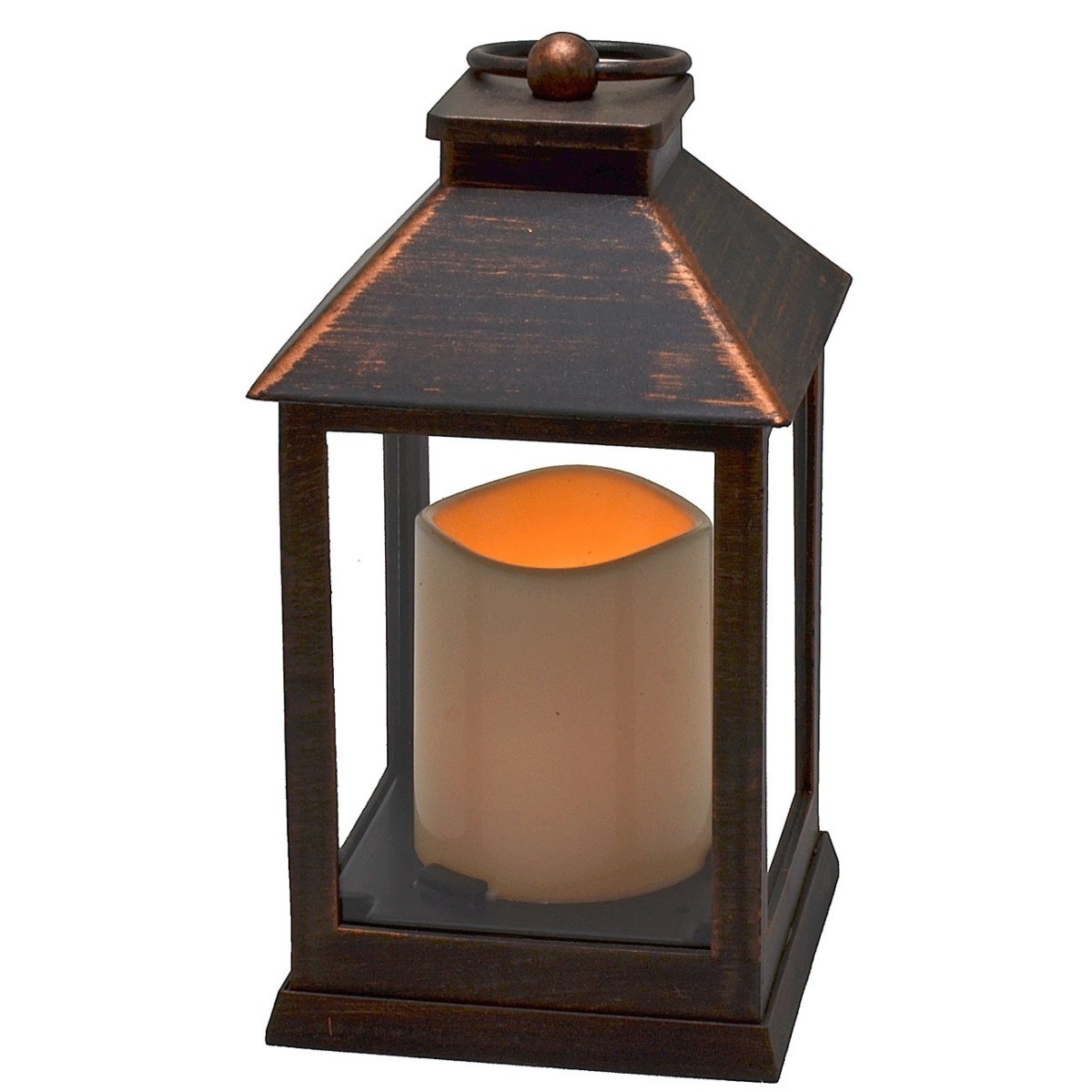 Lanterna nera effetto rame completa di candela bianca a luce tremolante. Questo complemento d'arredo illuminato dona calore all'atmosfera ed è adatto ad essere posizionato in qualsiasi ambiente in quanto funzionante a batterie (non incluse 3xAAA).